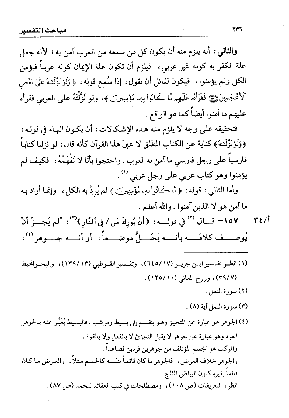 والثاني: أنه يلزم منه أن يكون كل من سمعه من العرب آمن به؛ لأنه جعل علة الكفر به كونه غير عربي، فيلزم أن تكون علة الإيمان كونه عربياً فيؤمن الكل ولم يؤمنوا، فيكون لقائل أن يقول: إذا سُمع قوله: {وَلَوْ نَزَّلْنَاهُ عَلَى بَعْضِ الْأَعْجَمِينَ (198) فَقَرَأَهُ عَلَيْهِمْ مَا كَانُوا بِهِ مُؤْمِنِينَ}، ولو نزلْتَهُ على العربي فقرأه عليهم ما آمنوا أيضاً كما هو الواقع.
