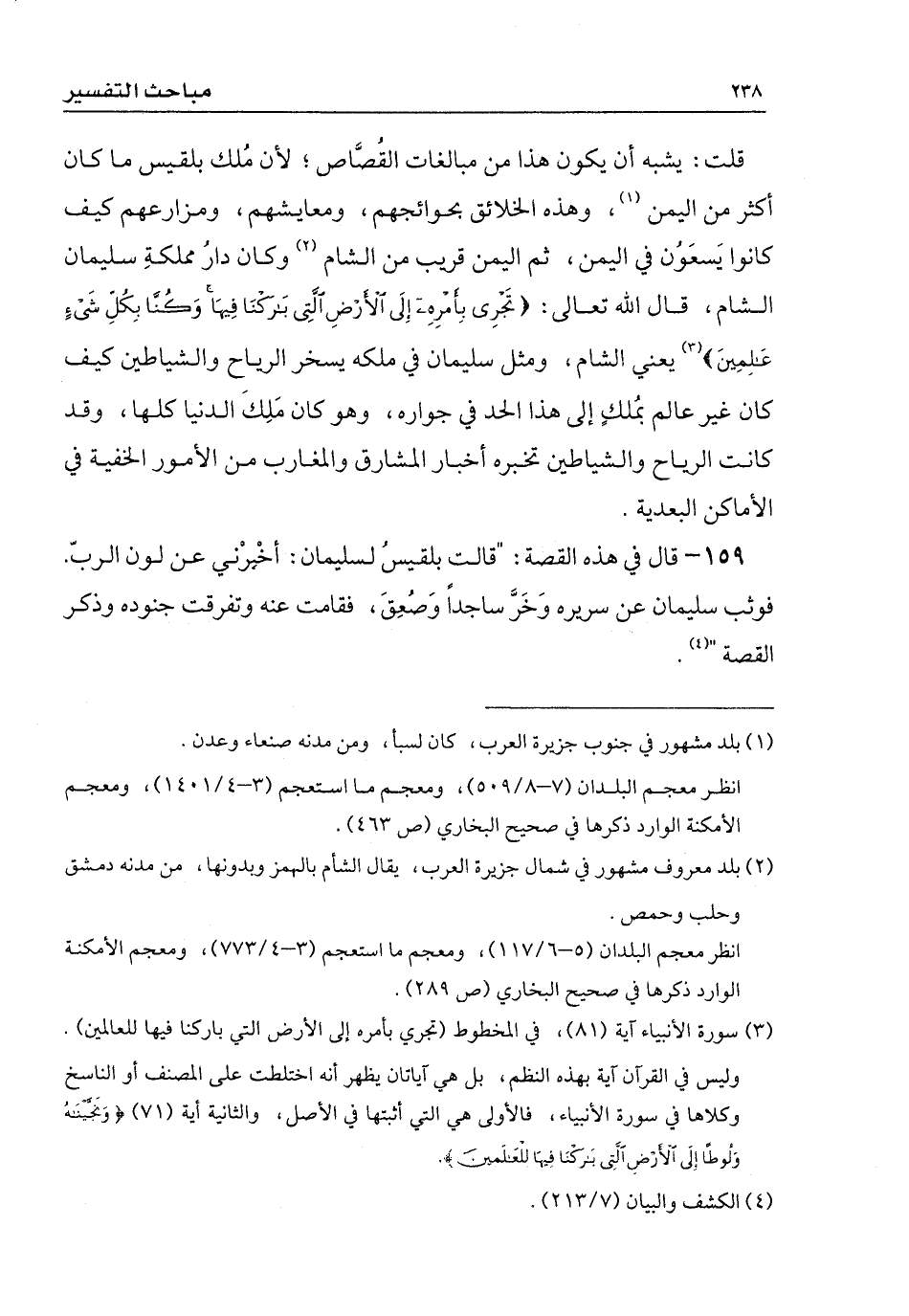 قلت: يشبه أن يكون هذا من مبالغات القُصَّاص؛ لأن مُلك بلقيس ما كان أكثر من اليمن، وهذه الخلائق بحوائجهم، ومعايشهم، ومزارعهم كيف كانوا يَسعَوُن في اليمن، ثم اليمن قريب من الشام وكان دارُ مملكةِ سليمان الشام، قال الله تعالى: {تَجْرِي بِأَمْرِهِ إِلَى الْأَرْضِ الَّتِي بَارَكْنَا فِيهَا وَكُنَّا بِكُلِّ شَيْءٍ عَالِمِينَ} يعني الشام، ومثل سليمان في ملكه يسخر الرياح والشياطين كيف كان غير عالم بمُلك إلى هذا الحد في جواره، وهو كان مَلِكَ الدنيا كلها، وقد كانت الرياح والشياطين تخبره أخبار المشارق والمغارب من الأمور الخفية في الأماكن البعدية.