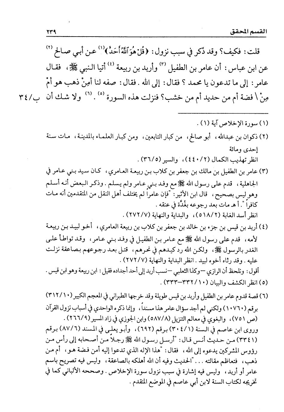 قلت: فكيف؟ وقد ذكر في سبب نزول: {قُلْ هُوَ اللهُ أَحَدٌ} عن أبي صالح عن ابن عباس: أن عامر بن الطفيل وأريد بن ربيعة أتيا النبي - صلى الله عليه وسلم -، فقال عامر: إلى ما تدعون يا محمد؟ فقال: إلى الله. فقال: صفه لنا أمِنْ ذهب هو أمْ مِنْ فضة أم من حديد أم من خشب؟ فنزلت هذه السورة. ولا شك أن
