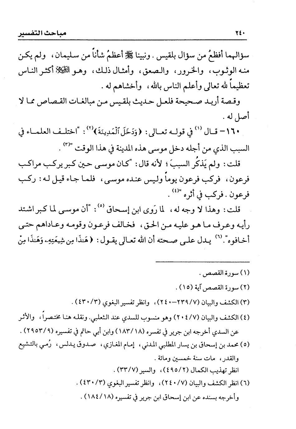 160 - قال في قوله تعالى: {وَدَخَلَ المدِينَةَ}: " اختلف العلماء في السبب الذي من أجله دخل موسى هذه المدينة في هذا الوقت ".