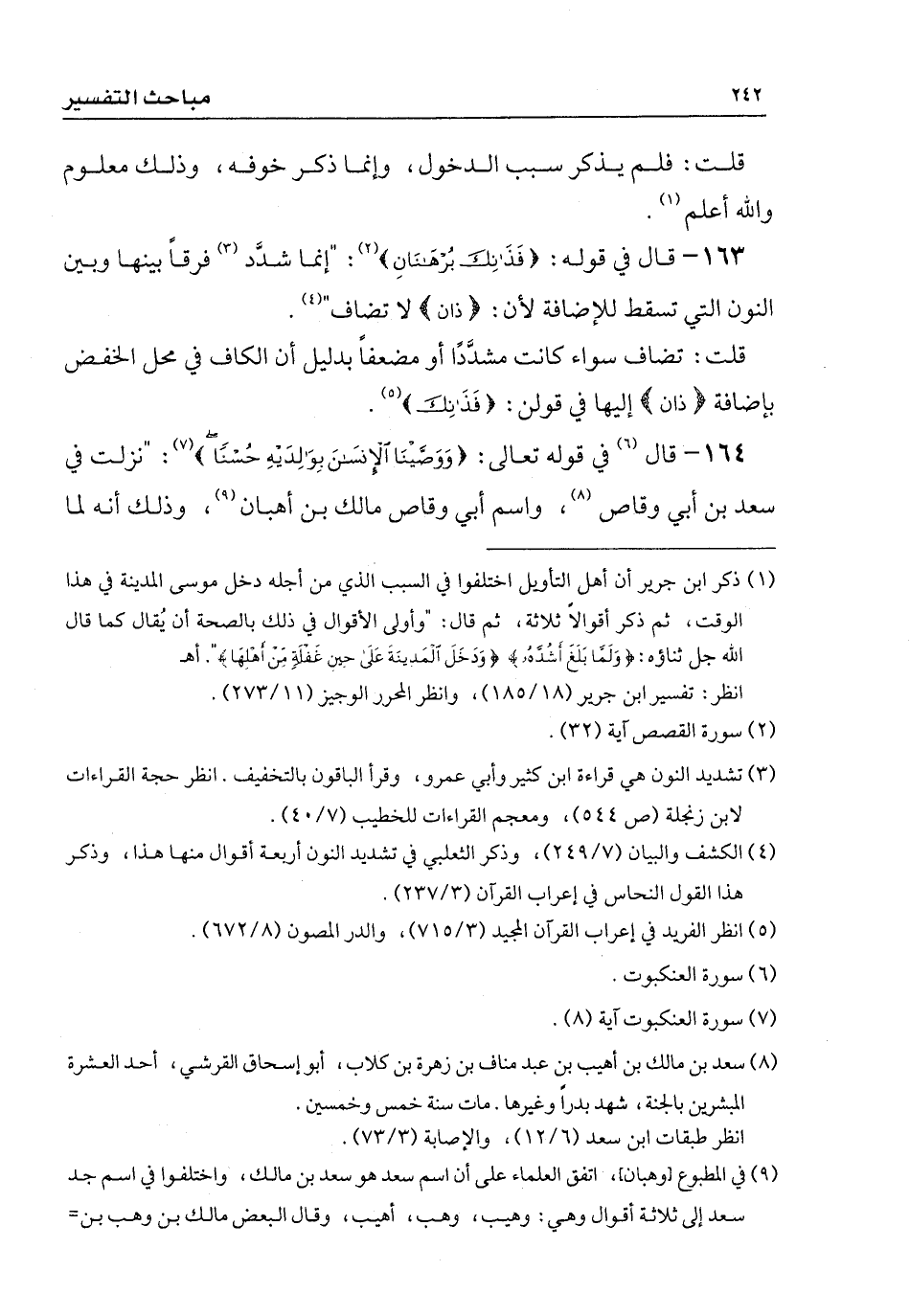 164 - قال في قوله تعالى: {وَوَصَّيْنَا الْإِنْسَانَ بِوَالِدَيْهِ حُسْنًا}: " نزلت في سعد بن أبي وقاص، واسم أبي وقاص مالك بن وهبان، وذلك أنه لما
