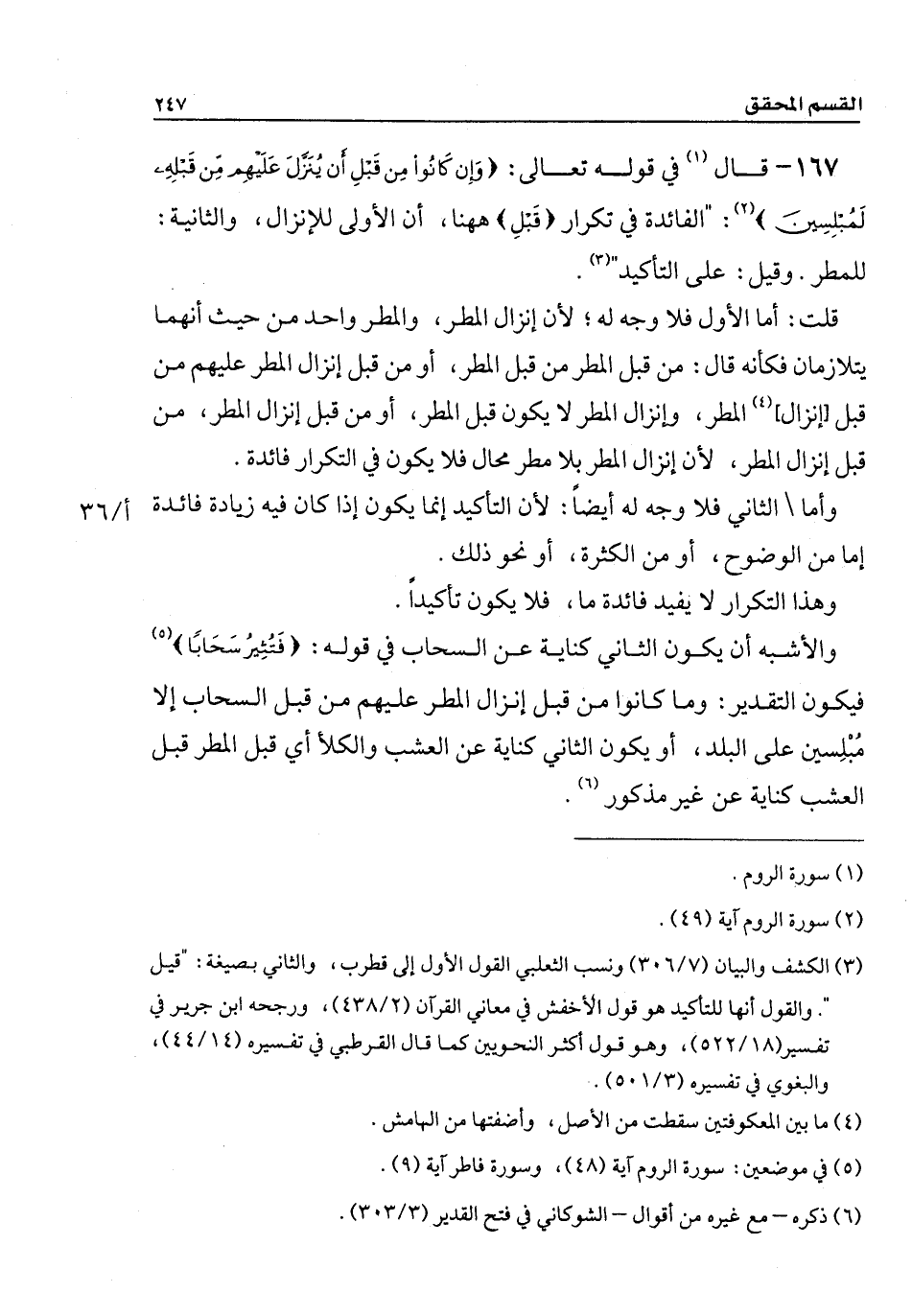 167 - قال في قوله تعالى: {وَإِنْ كَانُوا مِنْ قَبْلِ أَنْ يُنَزَّلَ عَلَيْهِمْ مِنْ قَبْلِهِ لَمُبْلِسِينَ}: " الفائدة في تكرار {قَبْلِ} ههنا، أن الأولى للإنزال، والثانية: للمطر. وقيل: على التأكيد ".