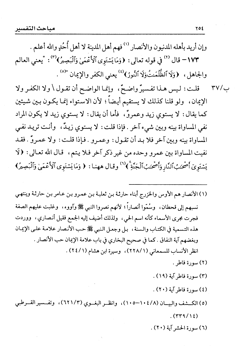 173 - قال في قوله تعالى: {وَمَا يَسْتَوِي الْأَعْمَى وَالْبَصِيرُ}: " يعني العالم والجاهل، {وَلَا الظُّلُمَاتُ وَلَا النُّورُ} يعني الكفر والإيمان ".