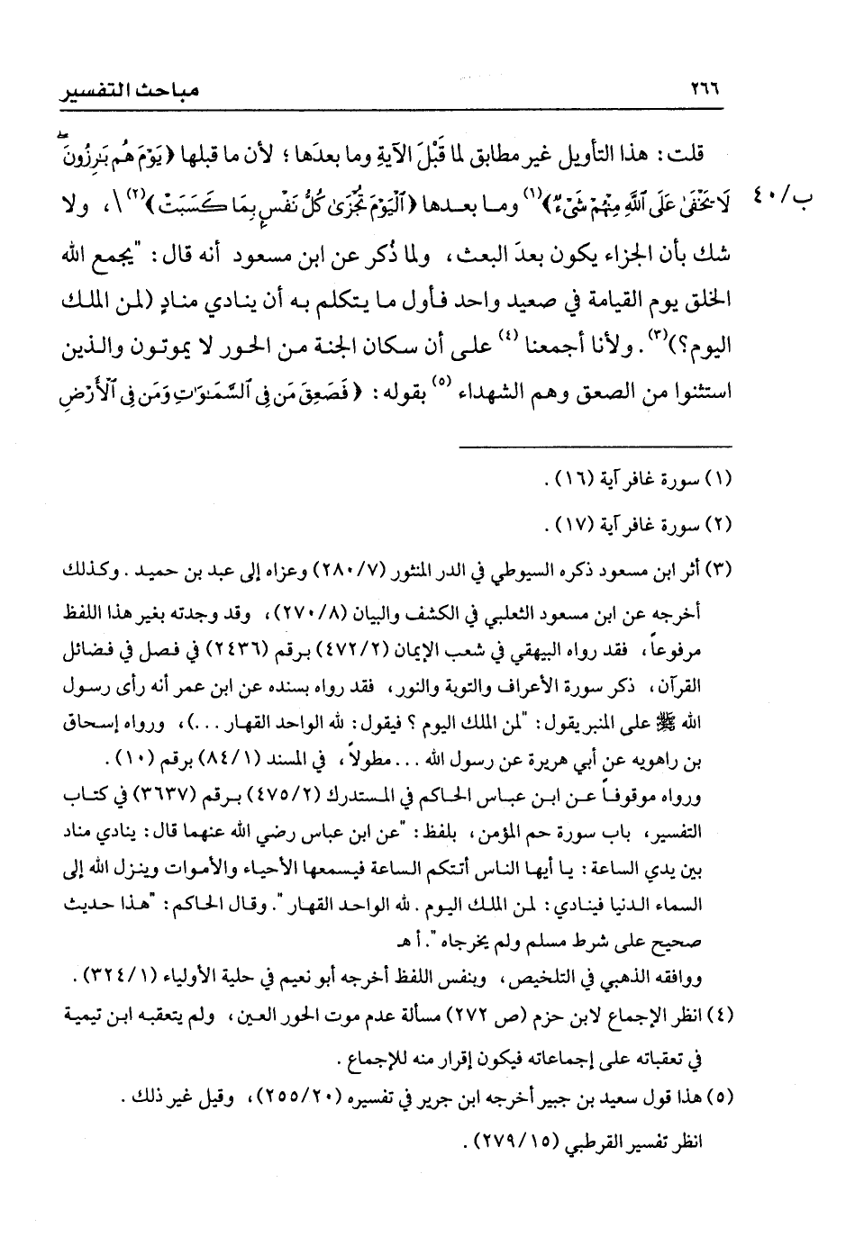 قلت: هذا التأويل غير مطابق لما قَبْلَ الآيةِ وما بعدَها؛ لأن ما قبلها {يَوْمَ هُمْ بَارِزُونَ لَا يَخْفَى عَلَى اللَّهِ مِنْهُمْ شَيْ} وما بعدها {الْيَوْمَ تُجْزَى كُلُّ نَفْسٍ بِمَا كَسَبَتْ}، ولا شك بأن الجزاء يكون بعدَ البعث، ولما ذكر عن ابن مسعود أنه قال: " يجمع الله الخلق يوم القيامة في صعيد واحد فأول ما يتكلم به أن ينادي منادٍ (لمن الملك اليوم؟). ولأنَّا أجمعنا على أن سكان الجنة من الحور لا يموتون والذين استثنوا من الصعق وهم الشهداء بقوله: {فَصَعِقَ مَنْ فِي السَّمَاوَاتِ وَمَنْ فِي الْأَرْضِ إِلَّا مَنْ شَاءَ اللهُ}