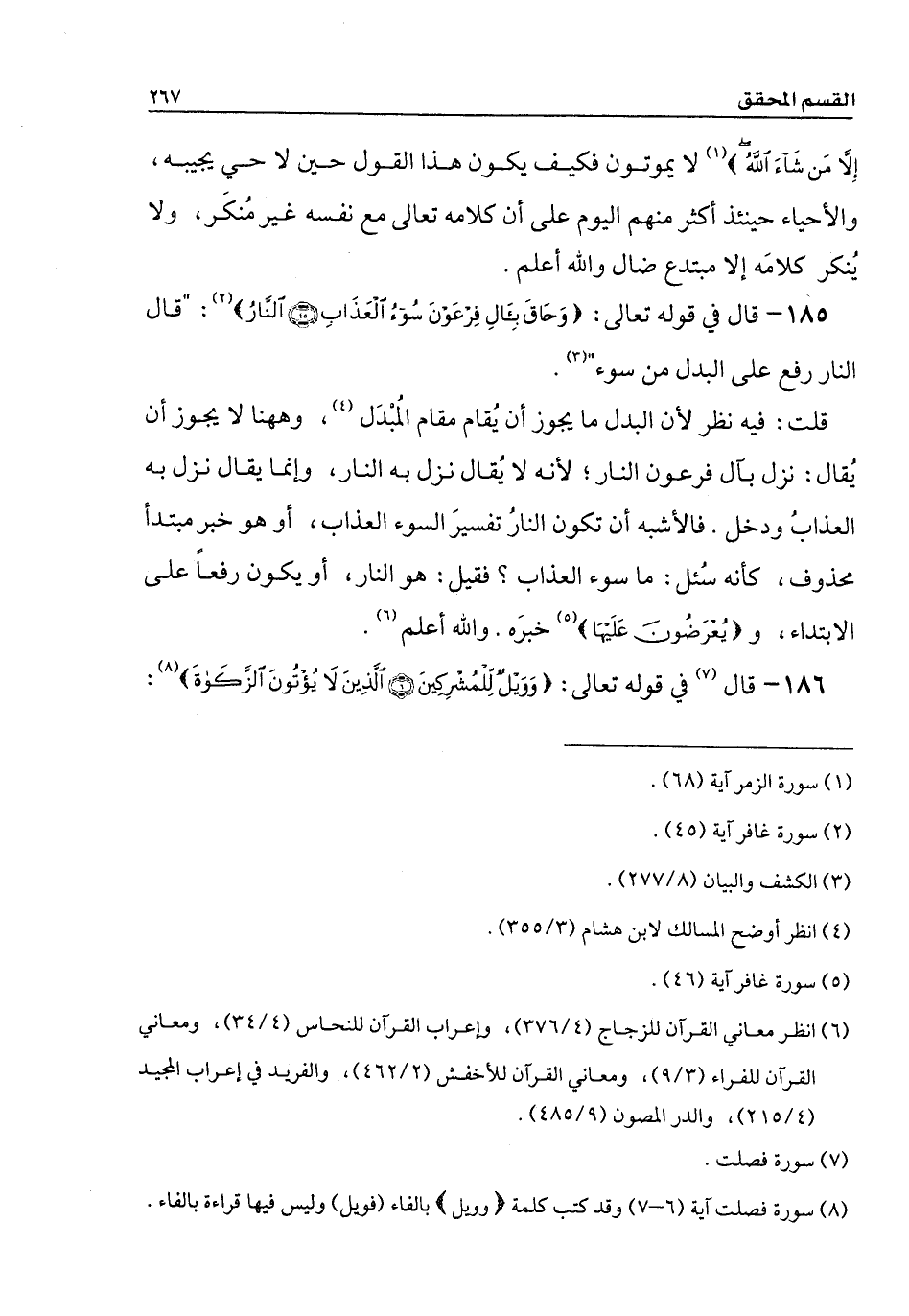 185 - قال في قوله تعالى: {وَحَاقَ بِآلِ فِرْعَوْنَ سُوءُ الْعَذَابِ (45) النَّارُ}: " قال النار رفع على البدل من سوء ".