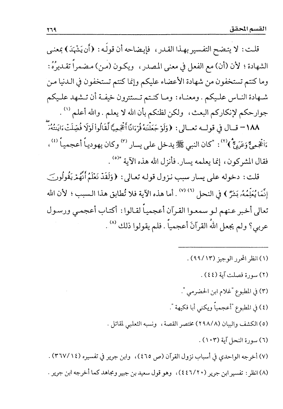 188 - قال في قوله تعالى: {وَلَوْ جَعَلْنَاهُ قُرْآنًا أَعْجَمِيًّا لَقَالُوا لَوْلَا فُصِّلَتْ آيَاتُهُ أَأَعْجَمِيٌّ وَعَرَبِيٌّ}: " كان النبي - صلى الله عليه وسلم - يدخل على يسار وكان يهودياً أعجمياً، فقال المشركون، إنما يعلمه يسار. فأنزل الله هذه الآية ".