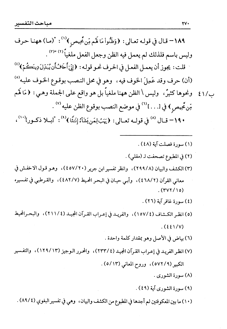 189 - قال في قوله تعالى: {وَظَنُّوا مَا لَهُمْ مِنْ مَحِيصٍ}: " (ما) ههنا حرف وليس باسم فلذلك لم يعمل فيه الظن وجعل الفعل ملغياً ".