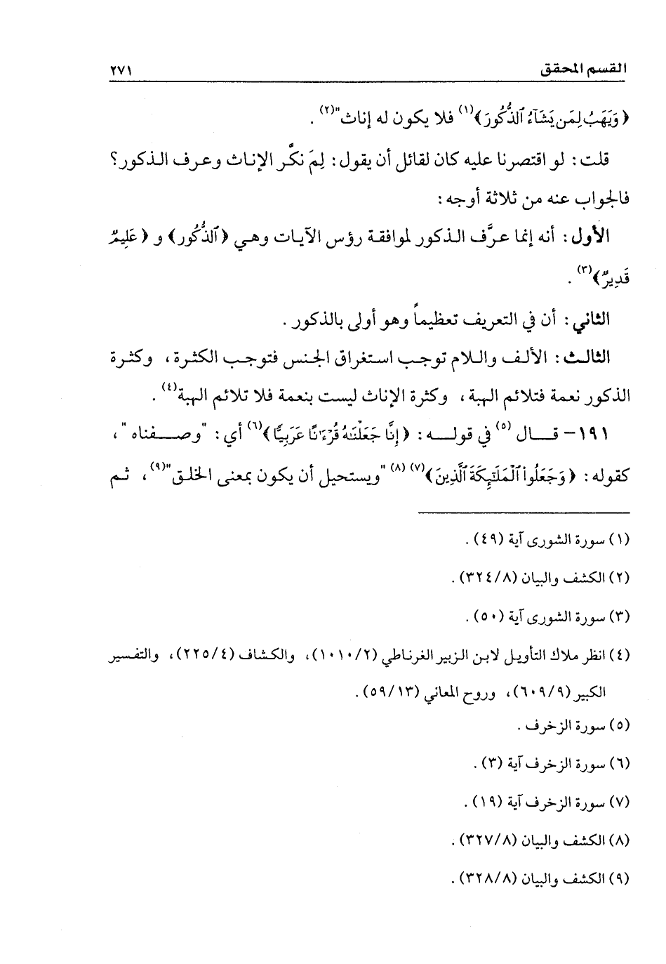 الأول: أنه إنما عرَّف الذكور لموافقة رؤس الآيات وهي {الذكُور} و {عَلِيمٌ قَدِيرٌ}.