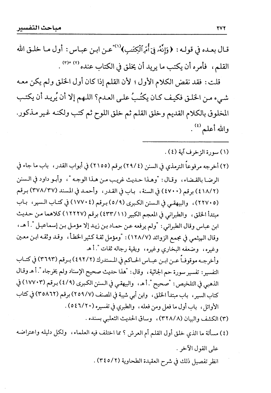 قال بعده في قوله: {وَإِنَّهُ فِي أُمِّ الْكِتَابِ} " عن ابن عباس: أول ما خلق الله القلم، فأمره أن يكتب ما يريد أن يخلق في الكتاب عنده ".