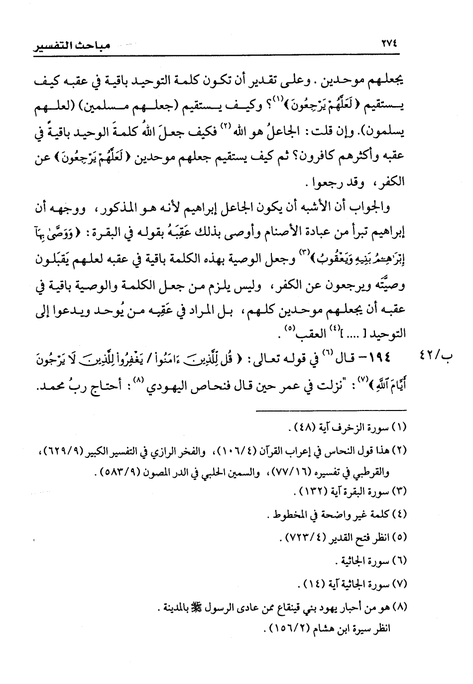 يجعلهم موحدين. وعلى تقدير أن تكون كلمة التوحيد باقية في عقبه كيف يستقيم {لَعَلَّهُمْ يَرْجِعُونَ}؟ وكيف يستقيم (جعلهم مسلمين) (لعلهم يسلمون). وإن قلت: الجاعلُ هو الله فكيف جعلَ اللهُ كلمةَ الوحيد باقيةً في عقبه وأكثرهم كافرون؟ ثم كيف يستقيم جعلهم موحدين {لَعَلَّهُمْ يَرْجِعُونَ} عن الكفر، وقد رجعوا.