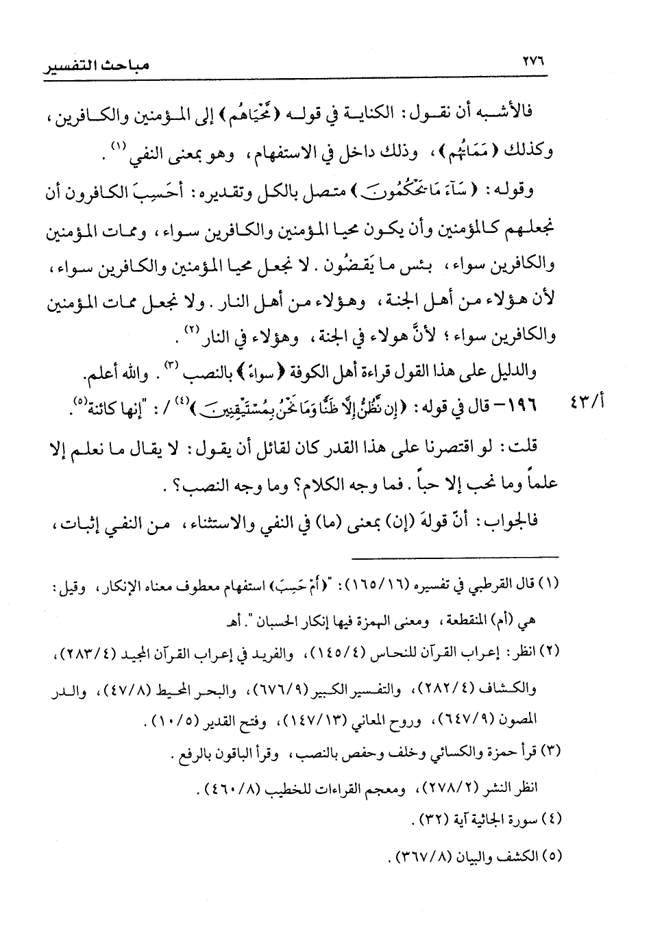 فالأشبه أن نقول: الكناية في قوله {مَحْيَاهُمْ} إلى المؤمنين والكافرين، وكذلك {مَمَاتُهُمْ}، وذلك داخل في الاستفهام، وهو بمعنى النفي.