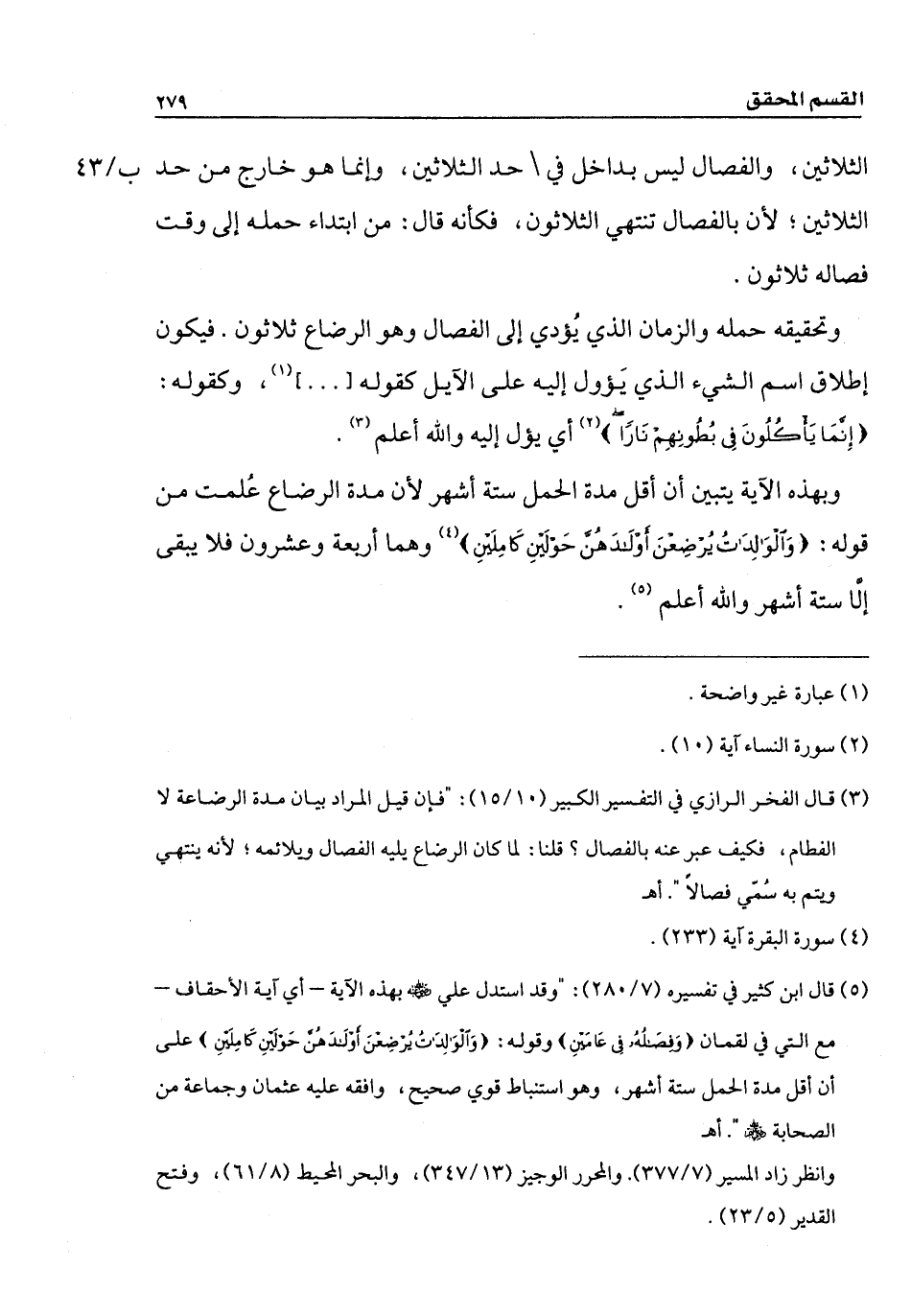 وبهذه الآية يتبين أن أقل مدة الحمل ستة أشهر لأن مدة الرضاع عُلمت من قولهِ: {وَالْوَالِدَاتُ يُرْضِعْنَ أَوْلَادَهُنَّ حَوْلَيْنِ كَامِلَيْنِ} وهما أربعة وعشرون فلا يبقى إلا ستة أشهر والله أعلم.