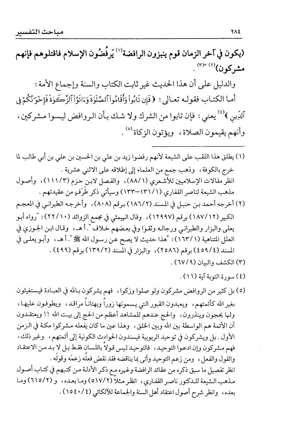 (يكون في آخر الزمان قوم ينبزون الرافضة يَرفُضُون الإسلام فاقتلوهم فإنهم مشركون).