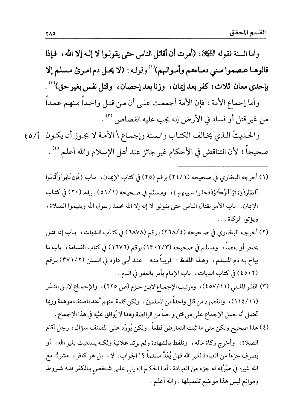 وأما السنة فقوله - صلى الله عليه وسلم -: (أمرت أن أقاتل الناس حتى يقولوا لا إله إلا الله، فإذا قالوها عصموا مني دماءهم وأموالهم) وقوله: {لا يحل دم امرئ مسلم إلا بإحدى معان ثلاث: كفر بعد إيمان، وزنا بعد إحصان، وقتل نفس بغير حق).