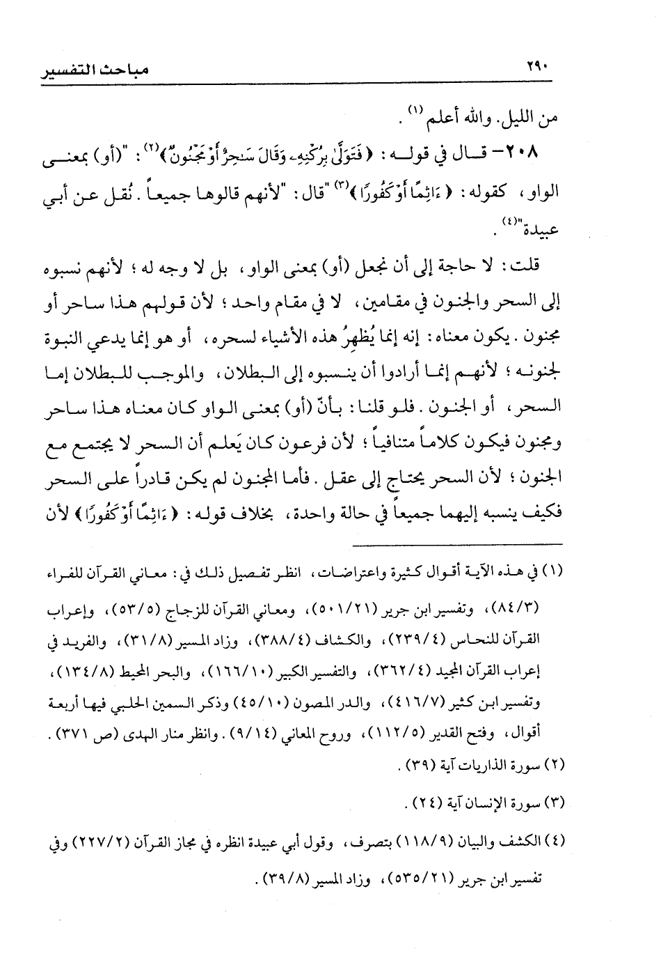 208 - قال في قوله: {فَتَوَلَّى بِرُكْنِهِ وَقَالَ سَاحِرٌ أَوْ مَجْنُونٌ}: " (أو) بمعنى الواو، كقوله: {آثِمًا أَوْ كَفُورًا}. قال: " لأنهم قالوها جميعاً. نُقل عن أبي عبيدة ".