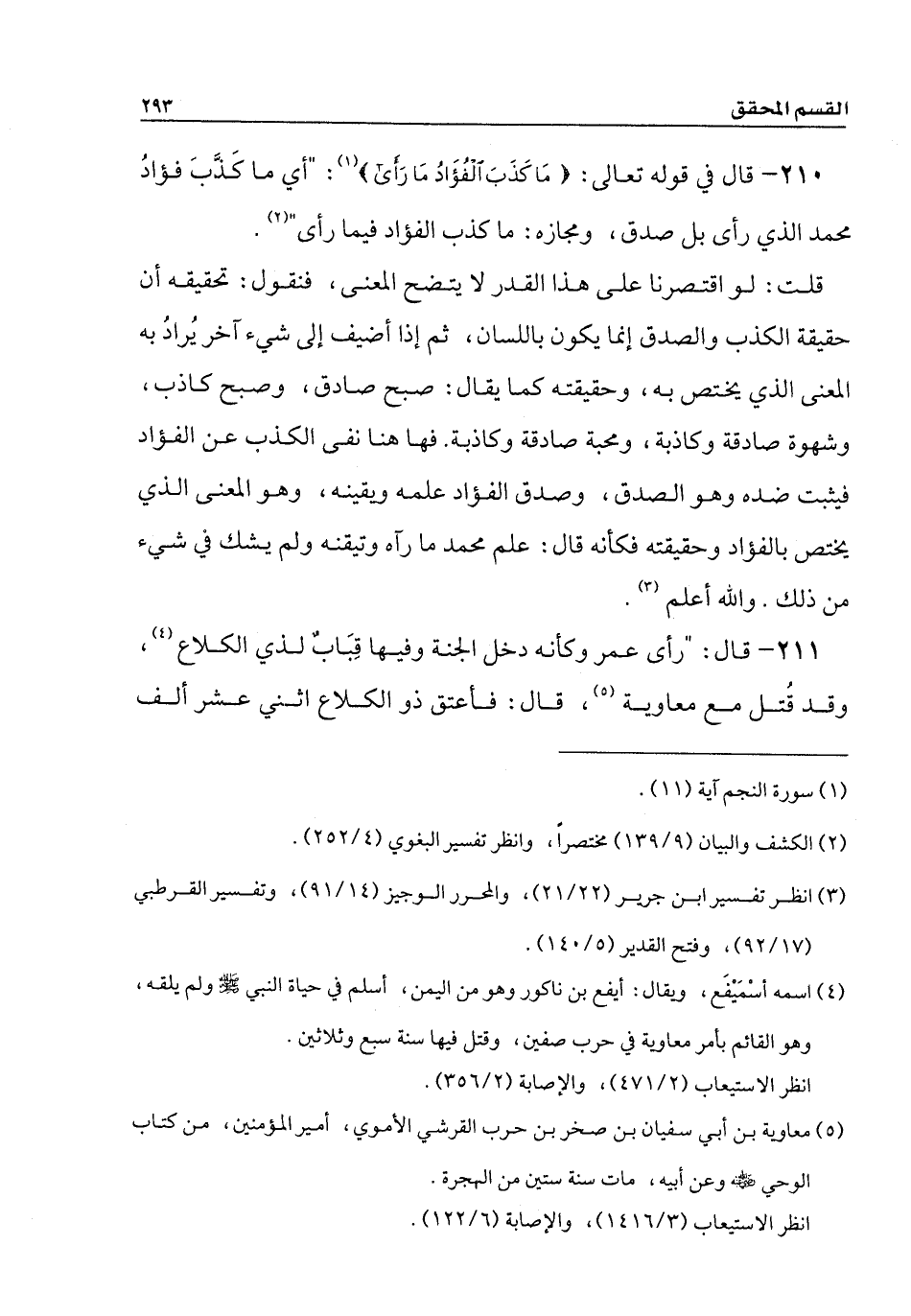 210 - قال في قوله تعالى: {مَا كَذَبَ الْفُؤَادُ مَا رَأَى}: " أي ما كَذبَ فؤادُ محمد الذي رأى بل صدق، ومجازه: ما كذب الفؤاد فيما رأى ".