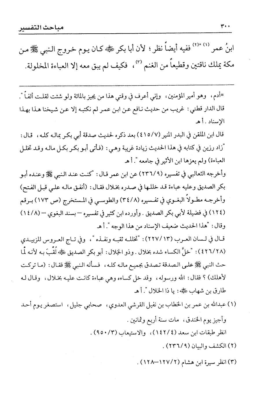 ابنُ عمر " ففيه أيضاً نظر؛ لأن أبا بكر - رضي الله عنه - كان يوم خروج النبي - صلى الله عليه وسلم - من مكة يملك ناقتين وقطيعاً من الغنم، فكيف لم يبق معه إلا العباءة المخلولة.