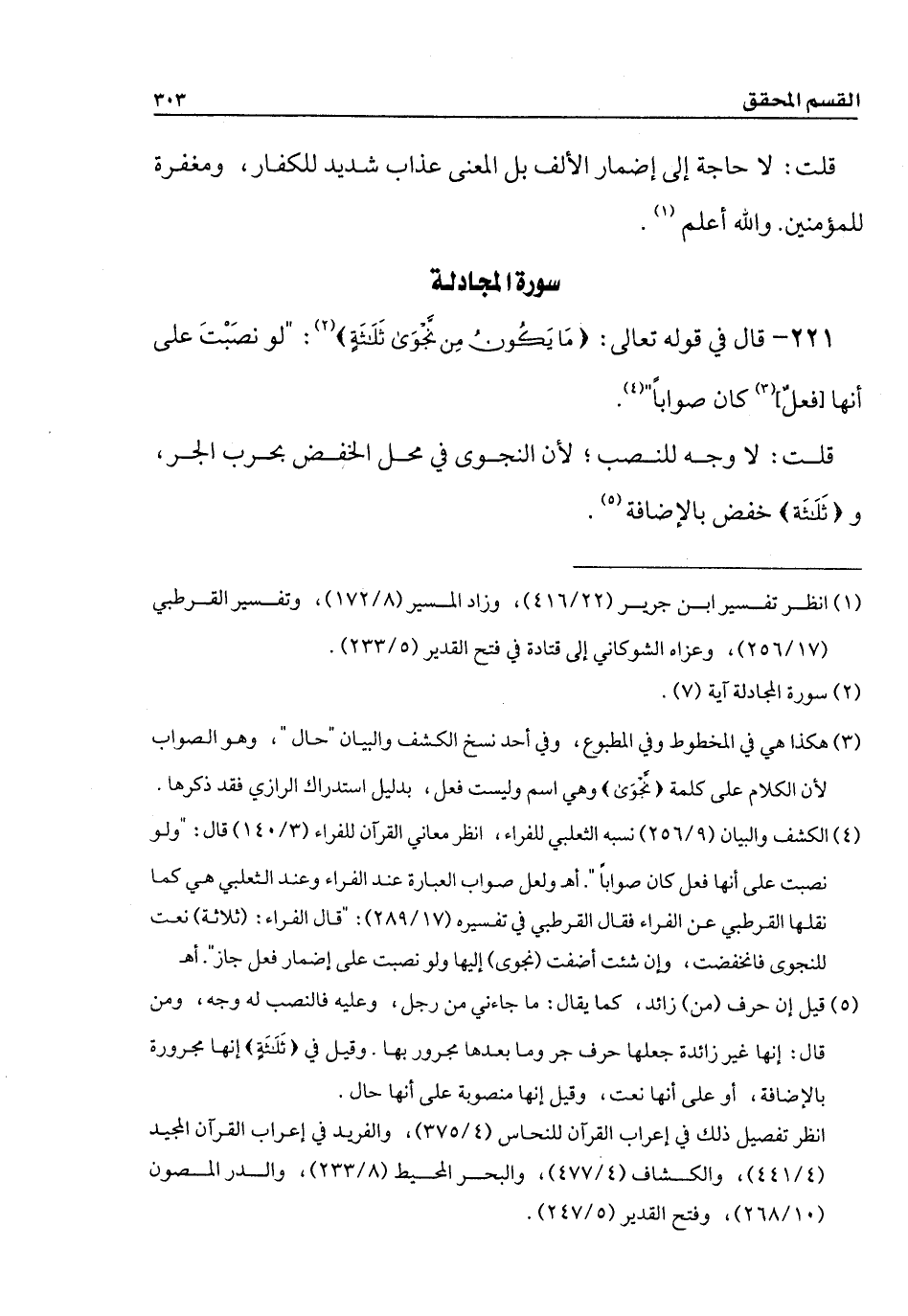 221 - قال في قوله تعالى: {مَا يَكُونُ مِنْ نَجْوَى ثَلَاثَةٍ}: " لو نصَبْتَ على أنها فعلٌ كان صواباً ".