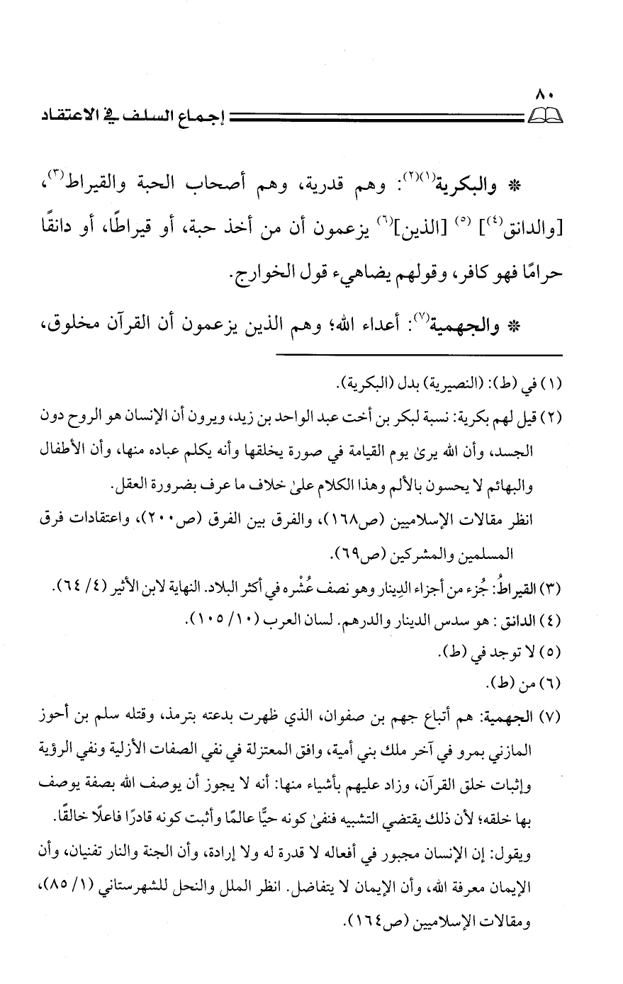 (¬٧) الجهمية: هم أتباع جهم بن صفوان، الذي ظهرت بدعته بترمذ، وقتله سلم بن أحوز المازني بمرو في آخر ملك بني أمية، وافق المعتزلة في نفي الصفات الأزلية ونفي الرؤية وإثبات خلق القرآن، وزاد عليهم بأشياء منها: أنه لا يجوز أن يوصف الله بصفة يوصف بها خلقه؛ لأن ذلك يقتضي التشبيه فنفى كونه حيًّا عالمًا وأثبت كونه قادرًا فاعلًا خالقًا. ويقول: إن الإنسان مجبور في أفعاله لا قدرة له ولا إرادة، وأن الجنة والنار تفنيان، وأن الإيمان معرفة الله، وأن الإيمان لا يتفاضل. انظر الملل والنحل للشهرستاني (١/ ٨٥)، ومقالات الإسلاميين (ص ١٦٤).