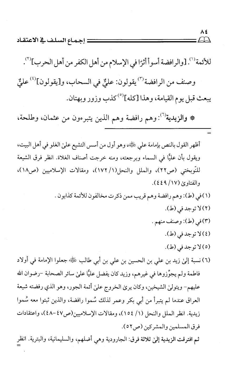 (¬٦) نسبة إلى زيد بن علي بن الحسين بن علي بن أبي طالب -رَضِيَ اللهُ عَنْهُ- جعلوا الإمامة في أولاد فاطمة ولم يجوِّزوها في غيرهم، وزيد كان يفضل عليًّا على سائر الصحابة -رضوان الله عليهم- ويتولى الشيخين، وكان يرى الخروج على أئمة الجور، وهو الذي رفضته شيعة العراق عندما لم يتبرأ من أبي بكر وعمر لذلك سُموا رافضة، والذين ثبتوا معه سُموا زيدية. انظر الملل والنحل (١/ ١٥٤)، ومقالات الإسلاميين (ص ٤٧ - ٤٨)، واعتقادات فرق المسلمين والمشركين (ص ٥٢).