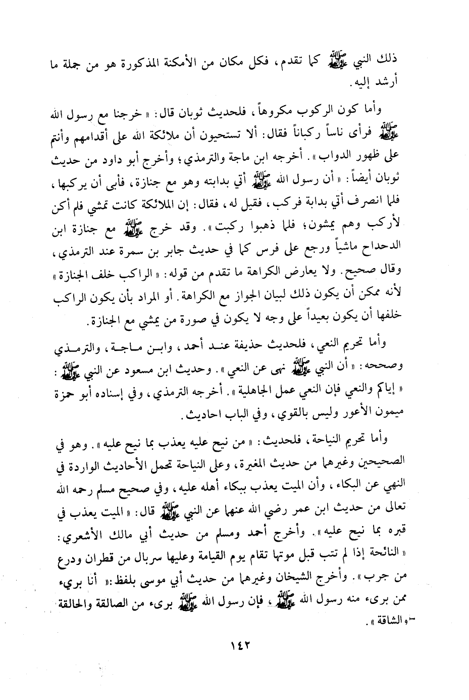وأما كون الركوب مكروها فلحديث ثوبان قال: "خرجنا مع رسول الله صلى الله عليه وسلم فرأى ناسا ركبانا فقال: "ألا تستحيون إن ملائكة الله على أقدامهم وأنتم على ظهور الدواب" أخرجه ابن ماجه والترمذي وأخرج أبوداود من حديث ثوبان أيضا أن رسول الله صلى الله عليه وسلم أتى بدابته وهو مع جنازة فأبى أن يركبها فلما أنصرف أتى بدابة فركب فقيل له فقال: "إن الملائكة كانت تمشى فلم أكن لأركب وهم يمشون فلما ذهبوا ركبت" وقد خرج صلى الله عليه وسلم مع جنازة ابن الدحداح ماشيا ورجع على فرس كما في حديث جابر ابن سمرة عند الترمذي وقال: صحيح ولا يعارض الكراهة ما تقدم من قوله: "الراكب خلف الجنازة" لأنه ممكن أن يكون لبيان الجواز مع الكراهة أو المراد بأن يكون الركب خلفها أن يكون بعيدا على وجهه لا يكون فيه صورة من يمشي مع الجنازة.
