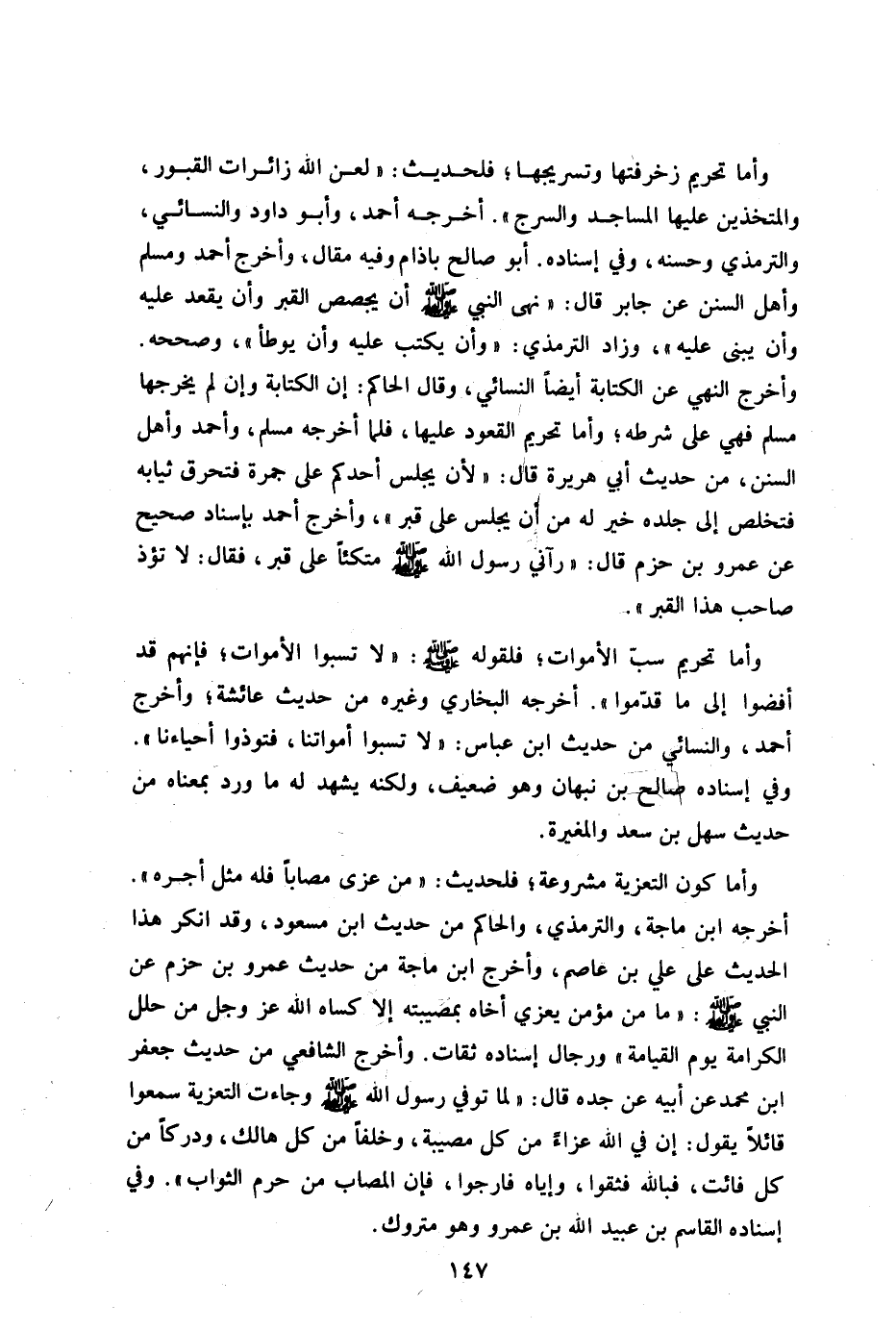 وأما تحريم زخرفتها وتسريجها فلحديث " لعن الله زائرات القبور والمتخذين عليها المساجد والسرج" أخرجه أحمد وأبو داود والنسائي والترمذي وحسنه وفي إسناده أبو صالح باذام وفيه مقال: وأخرج أحمد ومسلم وأهل السنن عن جابر قال: "نهى النبي صلى الله عليه وسلم أن يجصص القبر وأن يقعد عليه وأن يبني عليه" وزاد الترمذي "وأن يكتب عليه وأن يوطأ" وصححه وأخرج النهي عن الكتابة أيضا النسائي وقال الحاكم أن الكتابة وأن لم يخرجها مسلم فهي على شرطة وأما تحريم القعود عليها فلما أخرجه مسلم وأحمد وأهل السنن من حديث أبي هريرة قال: "لأن يجلس أحدكم على جمرة فتحرق ثيابه فتخلص إلى جلده خير له من أن يجلس على قبر" وأخرج أحمد بإسناد صحيح عن عمرو ابن حزم قال: "رآني رسول الله صلى الله عليه وسلم متكئا على قبر فقال: "لاتؤذ صاحب هذا القبر".