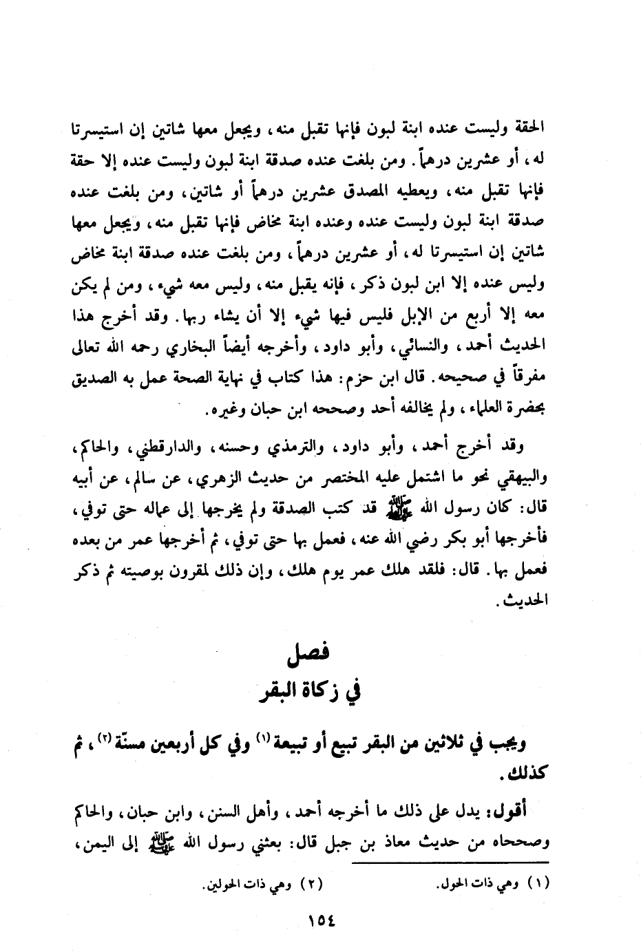 الحقة وليست عنده وعندة ابنة لبون فإنها تقبل منه ويجعل معها شاتين إن استيسرنا له أو عشرين درهما ومن بلغت عنده صدقة ابنة لبون وليست عنده إلا حقة فإنها تقبل منه ويعطيه المصدق عشرين درهما أو شاتين ومن بلغت عنده صدقة ابنة لبون وليست عنده وعنده ابنة مخاض فإنها تقبل منه ويجعل معها شاتين إن استسيرنا له او عشرين درهما ومن بلغت عنده صدقة ابنة مخاض وليس عنده إلا ابن لبون ذكر فإنه يقبل منه وليس معه شيء ومن لم يكن معه إلا أربع من الإبل فليس فيها شيء إلا أن يشاء ربها وقد أخرج هذا الحديث أحمد والنسائي وأبو داود وأخرجه أيضا البخاري رحمه الله تعالى مفرقا في صحيحة قال ابن حزم هذا كتاب في نهاية الصحة عمل به الصديق بحضرة العلماء ولم يخالفه أحد وصححه ابن حبان وغيره.