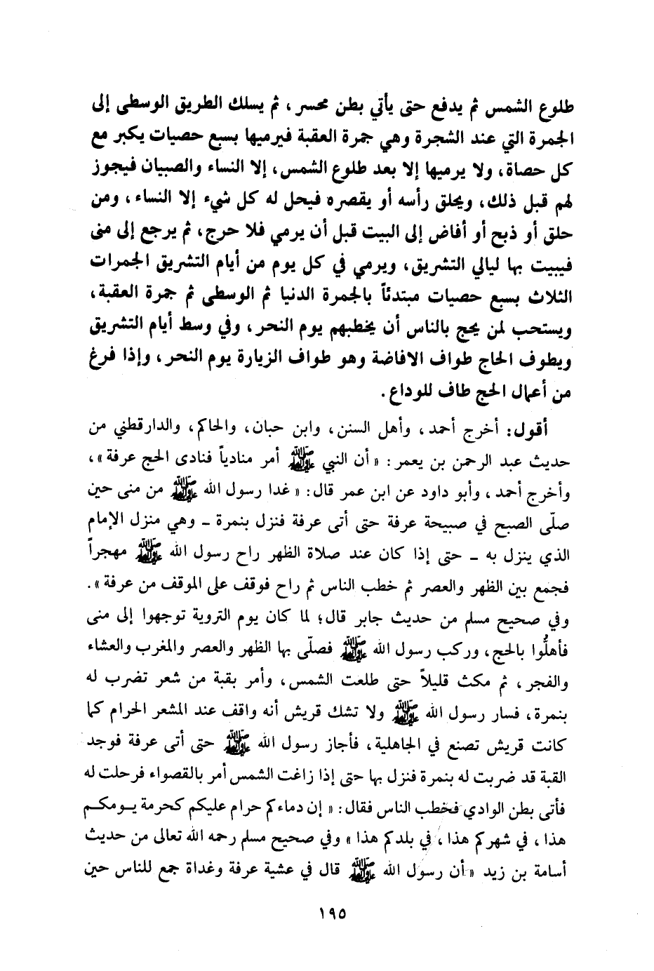 طلوع الشمس ثم يدفع حتى يأتي بطن محسر ثم يسلك الطريق الوسطى إلى الجمرة التى عند الشجرة وهي جمرة العقبة فيرميها بسبع حصيات يكبر مع كل حصاة ولا يرميها إلا بعد طلوع الشمس إلا النساء والصبيان فيجوز لهم قبل ذلك ويحلق رأسه أو يقصره فيحل له كل شيء إلا النساء ومن حلق أو ذبح أو أفاض إلى البيت قبل أن يرمي فلا حرج ثم يرجع إلى منى فيبيت بها ليالي التشريق ويرمي في كل يوم من أيام التشريق الجمرات الثلاث بسبع حصيات مبتدئا بالجمرة الدنيا ثم الوسطى ثم جمرة العقبة ويستحب لمن يحج بالناس أن يخطبهم يوم النحر وفي وسط أيام التشريق ويطوف الحاج طواف الإفاضة وهو طواف الزيارة يوم النحر وإذا فرغ من أعمال الحج طاف للوداع.