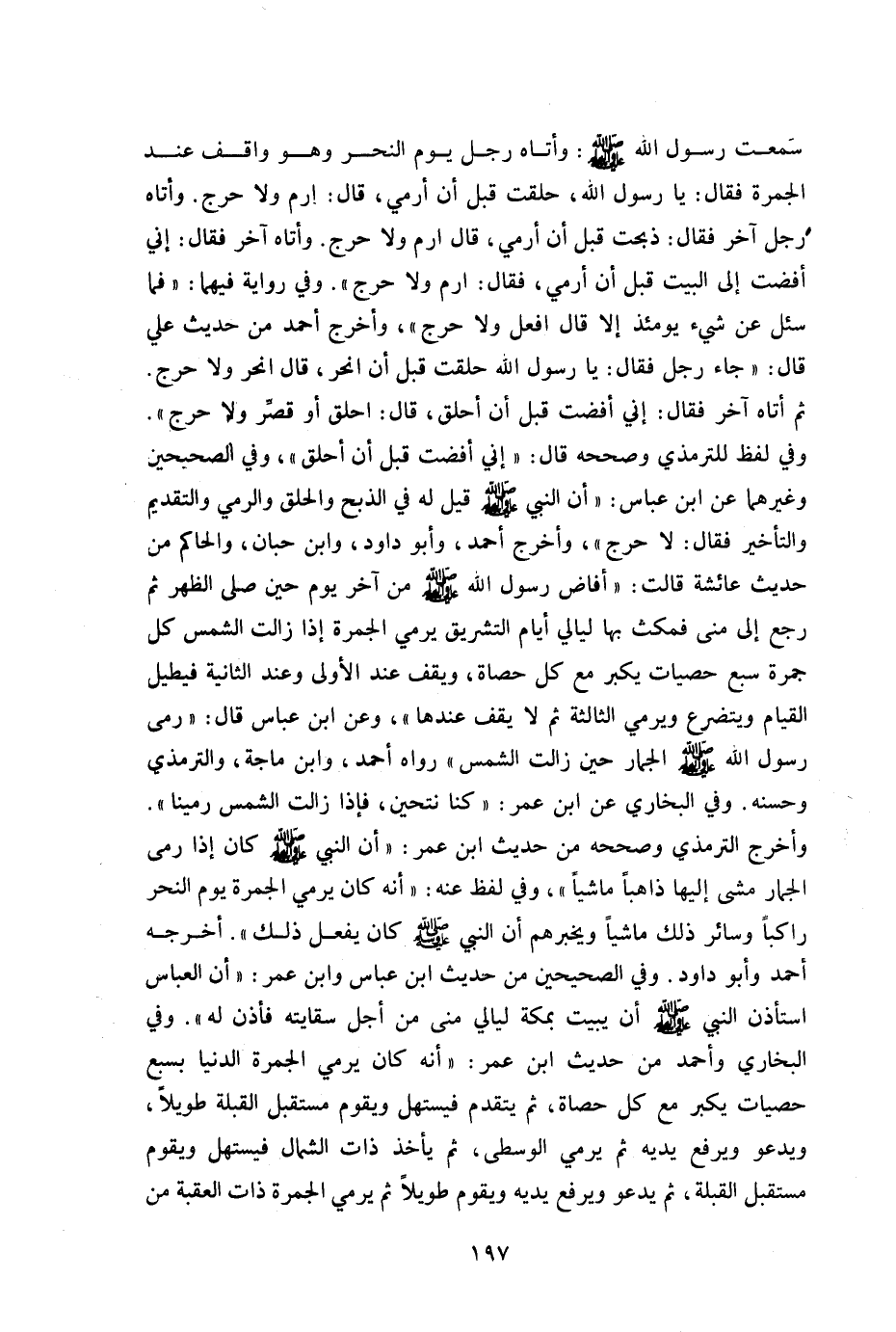 سمعت رسول الله صلى الله عليه وسلم وأتاه رجل يوم النحر وهو واقف عند الجمرة فقال: يارسول الله حلقت قبل أن أرمي قال: "أرم ولا حرج" وأتاه رجل آخر فقال: "ذبحت قبل أن أرمي قال: "أرم ولا حرج" وأتاه آخر فقال: إني أفضت إلى البيت قبل أن أرمي فقال: "ارم ولا حرج" وفي رواية فيهما "فما سئل عن شيء يومئذ إلا قال: "افعل ولا حرج" أخرجه أحمد من حديث علي قال: جاء رجل فقال: يا رسول الله صلى الله عليه وسلم حلقت قبل أن أنحر قال: "انحر ولا حرج" ثم أتاه آخر فقال: إني أفضت قبل أن أحلق قال: "احلق أو اقصر ولا حرج" وفي لفظ للترمذي وصححه قال: إني افضت قبل أن أحلق وفي الصحيحين وغيرهما عن ابن عباس أن النبي صلى الله عليه وسلم قيل له في الذبح والحلق والرمي والتقديم والتأخير فقال: "لاحرج" وأخرج أحمد وأبو داود وابن حبان والحاكم من حديث عائشة قالت: أفاض رسول الله صلى الله عليه وسلم من آخر يوم حين صلى الظهر ثم رجع إلى منى فمكث بها ليالي التشريق يرمي الجمرة إذا زالت الشمس كل جمرة سبع حصيات يكبر مع كل حصاه ويقف عند الأولى وعند الثانية فيطيل القيام ويتضرع ويرمى الثالثة ثم لا يقف عندها" وعن ابن عباس قال: رمى رسول الله صلى الله عليه وسلم الجمار حين زالت الشمس" رواه أحمد وابن ماجه والترمذي وحسنه وفي البخاري عن ابن عمر كنا نتحين فإذا زالت الشمس رمينا" وأخرج الترمذي وصححه من حديث ابن عمر أن النبي صلى الله عليه وسلم كان إذا رمى الجمار مشى إليها ذاهبا وراجعا" وفي لفظ عنه أنه كان يرمي الجمرة يوم النحر راكبا وسائر ذلك ماشيا ويخبرهم أن النبي صلى الله عليه وسلم كان يفعل ذلك" أخرجه أحمد وأبو داود وفي الصحيحين من حديث ابن عباس وابن عمر أن العباس استأذن النبي صلى الله عليه وسلم أن يبيت بمكة ليالي من أجل سقايته فأذن له" وفي البخاري وأحمد من حديث ابن عمر أنه كان يرمي الجمرة الدنيا بسبع حصيات يكبر مع كل حصاة ثم يتقدم فيستهل ويقوم مستقبل القبلة طويلا ويدعوا ويرفع يديه ثم يرمي الوسطى ثم يأخذ ذات الشمال فيستهل ويقوم مستبقل القبلة ثم يدعو ويرفع يديه ويقوم طويلا ثم يرمي الجمرة ذات العقبة من
