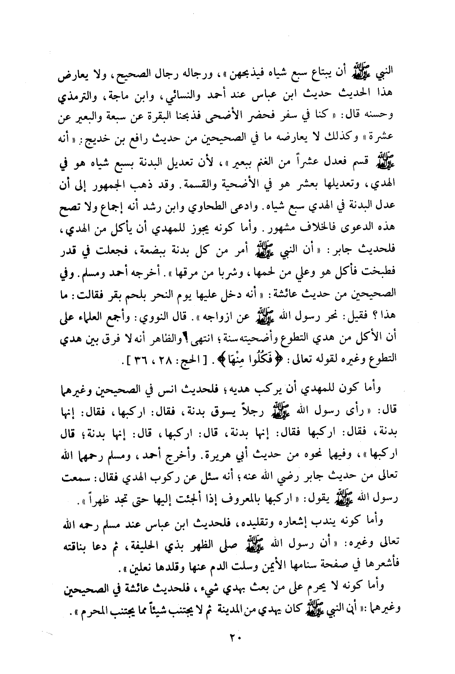 النبي صلى الله عليه وسلم أن يبتاع سبع شياه فيذبحهن" ورجاله رجال الصحيح ولا يعارض هذا الحديث حديث ابن عباس عند أحمد والنسائي وابن ماجه والترمذي وحسنه قال: كنا في سفرة فحضر الأضحى فذبحنا البقرة عن سبعة والبعير عن عشرة" وكذلك لا يعارضه ما في الصحيحين من حديث أبي رافع بن خديج أنه صلى الله عليه وسلم قسم فعدل عشرا من الغنم ببعير" لأن تعديل البدنة بسبع شياه هو في الهدي وتعديلها بعشر هو في الأضحية والقسمة وقد ذهب الجمهور إلى أن عدل البدنة في الهدي سبع شياه وادعى الطحاوى وابن رشد أنه إجماع ولا تصح هذه الدعوى فالخلاف مشهور وأما كونه يجوز للمهدي أن يأكل من الهدى فلحديث جابر أن النبي صلى الله عليه وسلم أمر من كل بدنة ببضعة فجعلت في قدر فطبخت فأكل هو وعلي من لحمها وشربا من مرقها" أخرجه أحمد ومسلم وفي الصحيحين من حديث عائشة أنه دخل عليها يوم النحر بلحم بقر فقالت: ما هذا فقيل نحر رسول الله صلى الله عليه وسلم عن أزواجه" قال: النووي وأجمع العلماء على أن الأكل من هدي التطوع وأضحيته سنة انتهى والظاهر أنه لا فرق بين هدي التطوع وغيره لقوله تعالى: {فَكُلُوا مِنْهَا} [الحج:28]