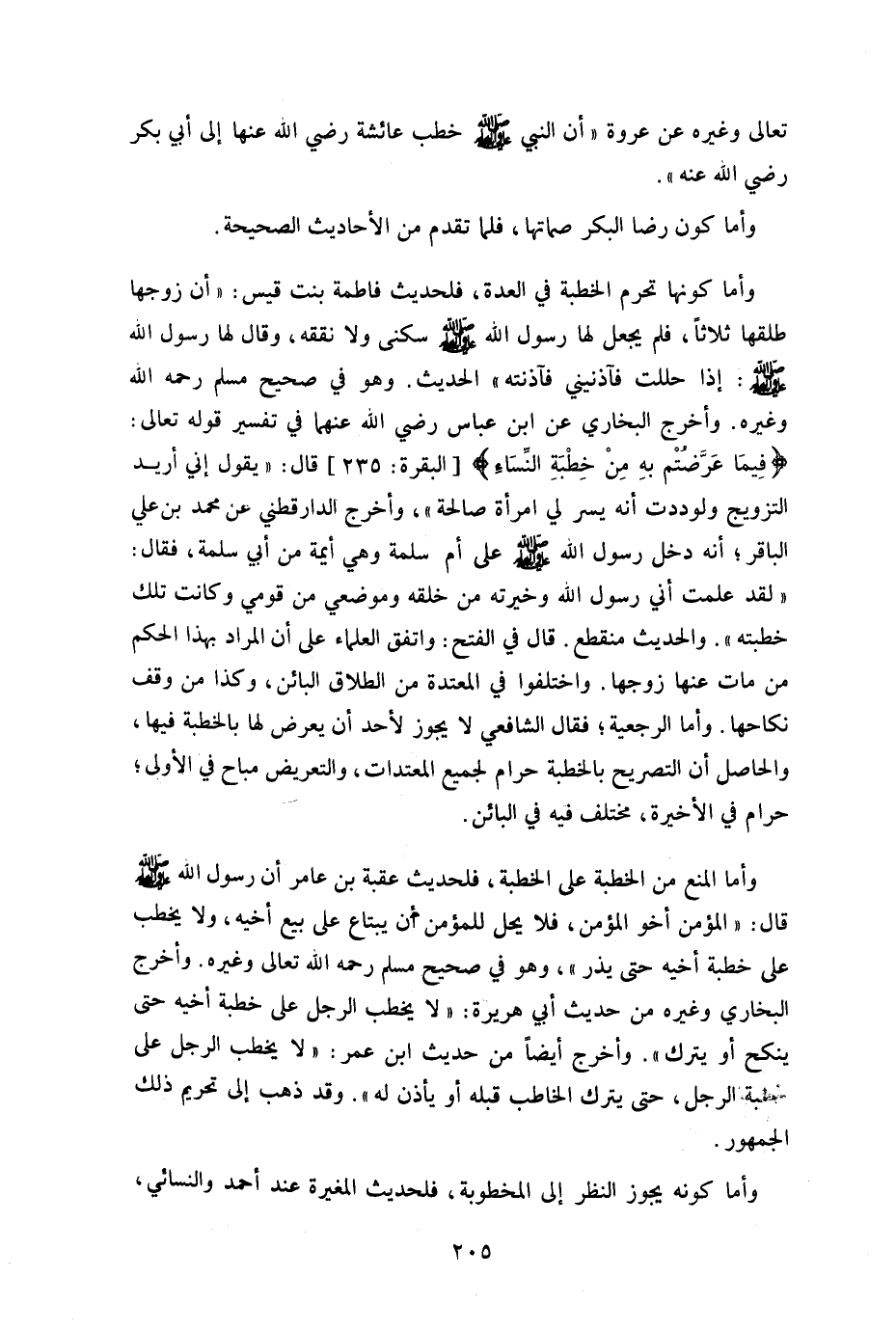 وأما كونها تحرم الخطبة في العدة فلحديث فاطمة بنت قيس أن زوجها طلقها ثلاثا فلم يجعل لها رسول الله صلى سكنى ولا نفقة وقال لها رسول الله صلى الله عليه وسلم: "إذا حللت فآذنينى فآذنته" الحديث وهو في صحيح مسلم رحمه الله تعالى وأخرج البخاري عن ابن عباس رضي الله عنهما في تفسير قوله تعالى: {فِيمَا عَرَّضْتُمْ بِهِ مِنْ خِطْبَةِ النِّسَاءِ} [البقرة:235] قال: يقول أريد التزويج ولوددت أنه يسر لى امرأة صالحة" وأخرج الدارقطني عن محمد بن على الباقر أنه دخل رسول الله صلى الله عليه وسلم على أم سلمة وهي أيمة أبي سلمة فقال: علمت أني رسول الله وخيرته من خلقه وموضعى من قومي وكانت تلك خطبته" والحديث منقطع قال: في الفتح واتفق العلماء على أن المراد بهذا الحكم من مات عنها زوجها واختلفوا في المعتدة من الطلاق البائن وكذا من وقف نكاحها وأما الرجعية فقال: الشافعي لا يجوز لأحد أن يعرض لها بالخطبة فيها والحاصل أن التصريح بالخطبة حرام لجميع المعتدات والتعريض مباح في الأولى وحرام في الأخيرة مختلف فيه البائن.