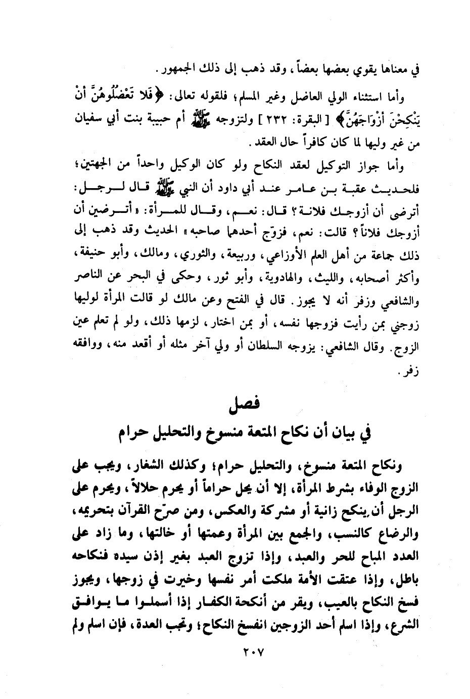 ونكاح المتعة منسوخ والتحليل حرام وكذلك الشغار ويجب على الزوج الوفاء بشرط المرأة إلا أن يحل حراما أو يحرم حلالا ويحرم على الرجل أن ينكح زانية أو مشركة وبالعكس ومن صرح القرآن بتحريمه والرضاع كالنسب والجمع بين المرأة وعمتها أوخالتها ومازاد على العدد المباح للحر والعبد وإذا تزوج العبد بغير إذن سيده فنكاحه باطل وإذا عتقت الأمة ملكت أمر نفسها وخيرت في زوجها ويجوز فسخ النكاح بالعيب ويقر من أنكحة الكفار إذا أسلموا مايوافق الشرع وإذا أسلم أحد الزوجين انفسخ النكاح وتجب العدة فإن أسلم ولم