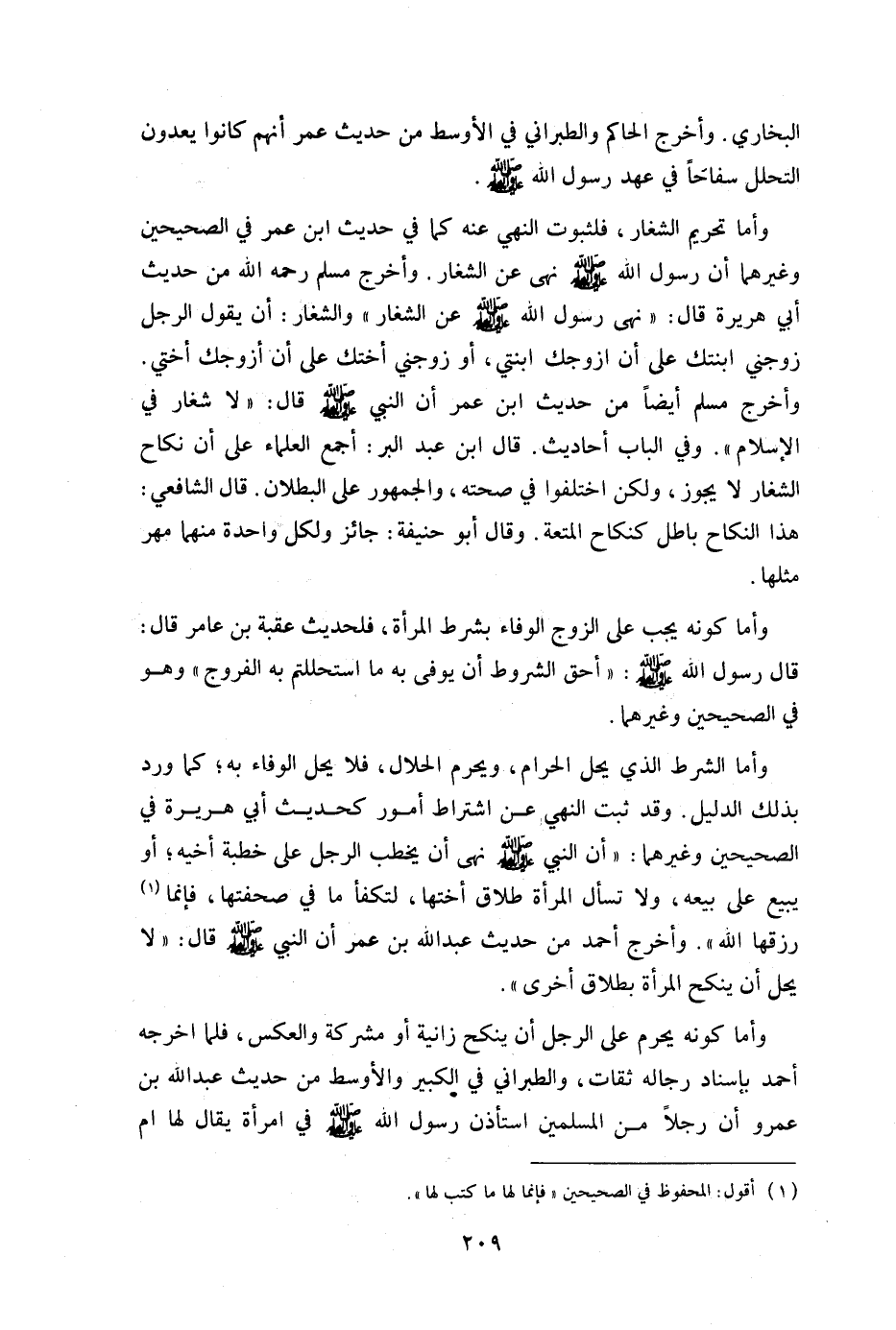 وأما الشرط الذي يحل الحرام ويحرم الحلال فلا يحل الوفاء به كما ورد بذلك الدليل وقد ثبت النهي عن اشتراط أمور كحديث أبي هريرة في الصحيحين وغيرهما أن النبي صلى الله عليه وسلم نهى أن يخطب الرجل على خطبة أخيه أو يبيع على بيعه ولا تسأل المرأة عن طلاق أختها لتكفأ ما في صحفتها فإنما رزقها الله" وأخرج أحمد من حديث عبد الله بن عمر أن النبي صلى الله عليه وسلم قال: "لا يحل أن ينكح المرأة بطلاق أخرى".