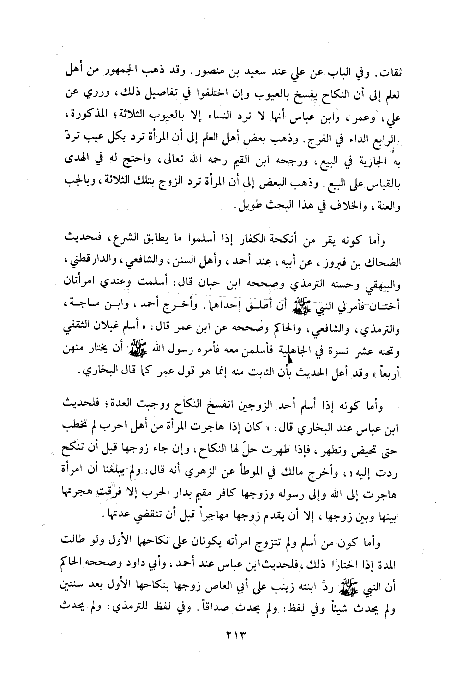 وأما كونه إذا أسلم أحد الزوجين انفسخ النكاح ووجبت العدة فلحديث ابن عباس عند البخاري قال: "كان إذا هاجرت المرأة من أهل الحرب لم تخطب حتى تحيض وتطهر فإذا طهرت حل لها النكاح وإن جاء زوجها قبل أن تنكح ردت إليه" وأخرج مالك في الموطأ عن الزهري أنه قال: ولم يبلغنا أن امرأة هاجرت إلى الله ورسوله وزوجها كافر مقيم بدار الحرب إلافرقت هجرتها بينها وبين زوجها إلاأن يقدم زوجها مهاجرا قبل أن تنقضي عدتها.
