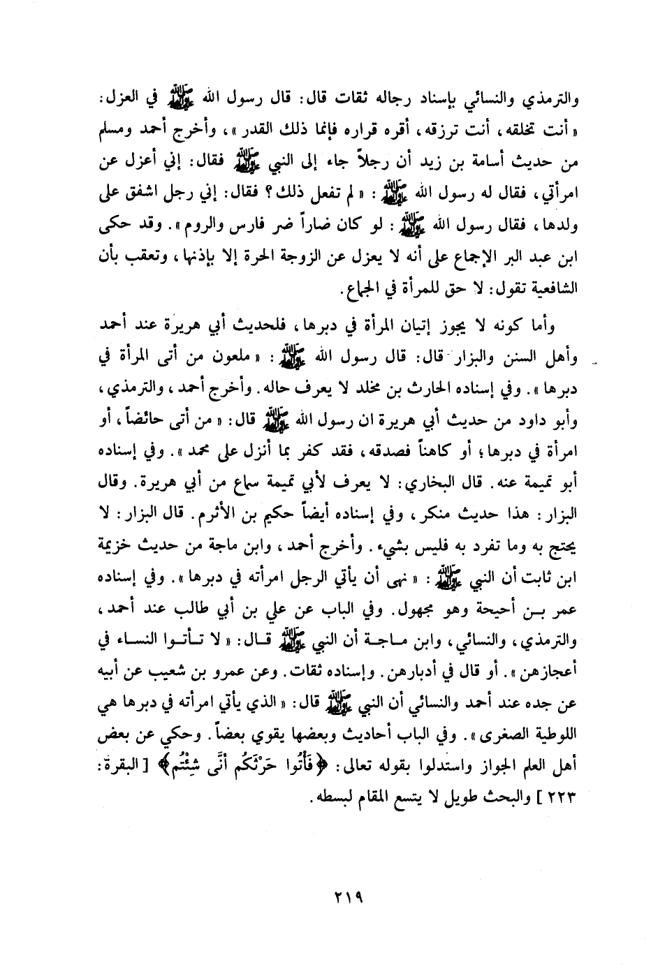 وأما كونه لايجوز إتيان المرأة في دبرها فلحديث أبي هريرة عند أحمد وأهل السنن والبزار قال: قال رسول الله صلى الله عليه وسلم "ملعون من أتى المرأة في دبرها" وفي إسناده الحارث بن مخلد لا يعرف حاله وأخرج أحمد والترمذي وأبو داود من حديث أبي هريرة أن رسول الله صلى الله عليه وسلم قال: "من أتى حائضا أو امرأة في دبرها أو كاهنا فصدقه فقد كفر بما أنزل على محمد" وفي إسناده أبو تميمة عنه قال: البخاري لا يعرف لأبي تميمة سماع من أبي هريرة وقال: البزار هذا حديث منكر وفي إسناده أيضا حكيم بن الأثرم قال: البزار لا يحتج به وما تفرد به فليس بشيء وأخرج أحمد وابن ماجه من حديث خزيمة بن ثابت أن النبي صلى الله عليه وسلم نهى أن يأتى الرجل امرأته في دبرها وفي إسناده عمر ابن أحيحة وهو مجهول وفي الباب عن علي ابن أبي طالب عند أحمد والترمذي والنسائي وابن ماجه أن النبي صلى الله عليه وسلم قال: "لا تأتوا النساء في أعجازهن" أو قال: في أدبارهن وإسناده ثقات وعن عمرو بن شعيب عن أبيه عن جده عند أحمد والنسائي أن النبي صلى الله عليه وسلم قال: " الذي يأتي امرأته في دبرها هي اللوطية الصغرى" وفي الباب أحاديث وبعضها يقوي بعضا وحكى عن بعض أهل العلم الجواز واستدلوا بقوله: تعالى {فَأْتُوا حَرْثَكُمْ أَنَّى شِئْتُمْ} [البقرة:223] والبحث طويل لا يتسع المقام لبسطه.