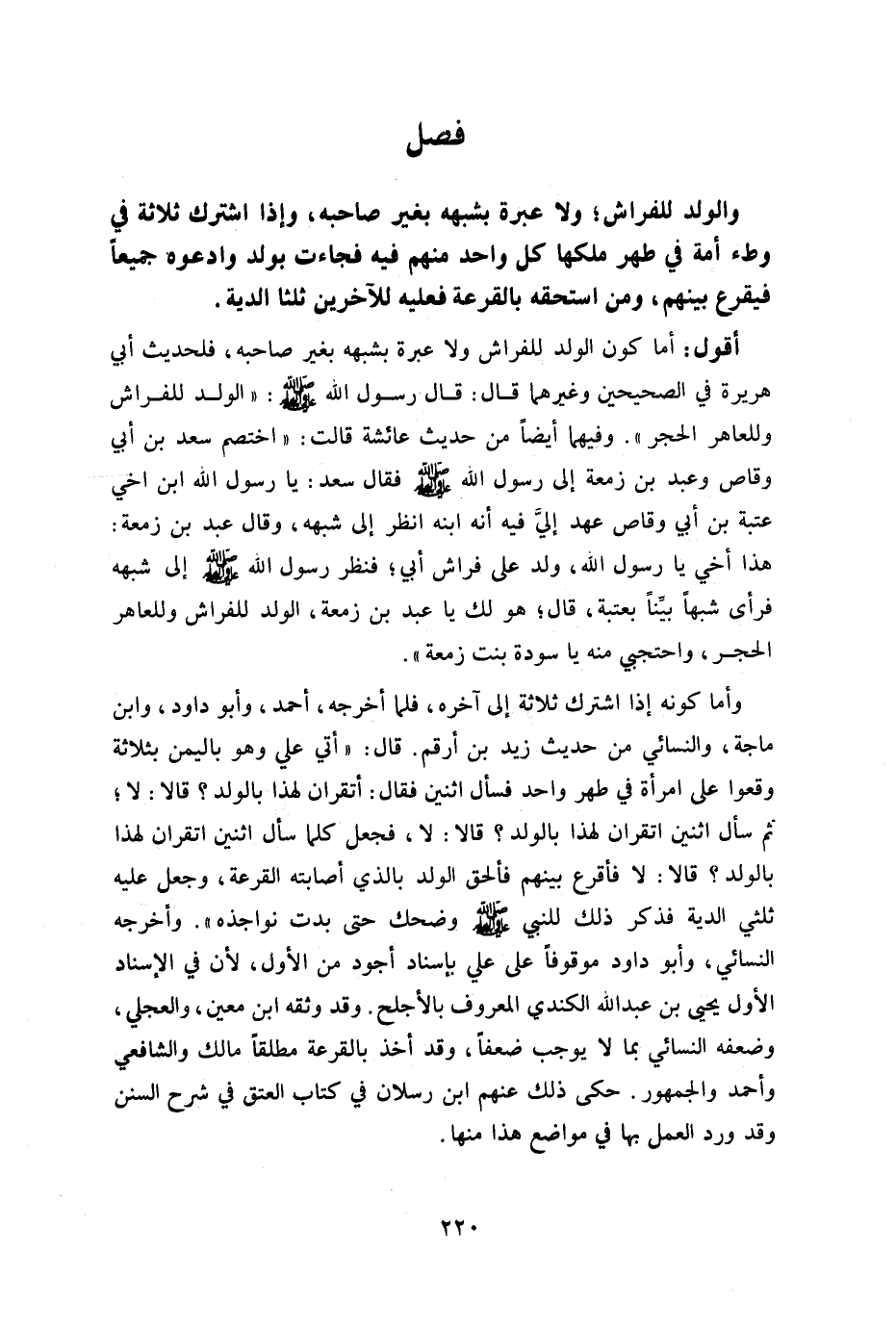 أقول: أما كون الولد للفراش ولا عبرة بشبهه بغير صاحبه فلحديث أبي هريرة في الصحيحين وغيرهما قال: قال رسول الله صلى الله عليه وسلم: "الولد للفراش وللعاهر الحجر" وفيها أيضا من حديث عائشة قالت: "اختصم سعد ابن أبي وقاص وعبد بن زمعة إلى رسول الله صلى الله عليه وسلم فقال: سعد يارسول الله ابن أخي عتبة بن أبي وقاص عهد إلي فيه أنه ابنه انظر إلى شبهة وقال: عبد بن زمعة هذا أخي يا رسول الله ولد على فراش أبي فنظر رسول الله صلى الله عليه وسلم إلى شبهه فرأى شبها بينا بعتبة وقال: هو لك يا عبد بن زمعة الولد للفراش وللعاهر الحجر واحتجبي منه يا سودة بنت زمعة".