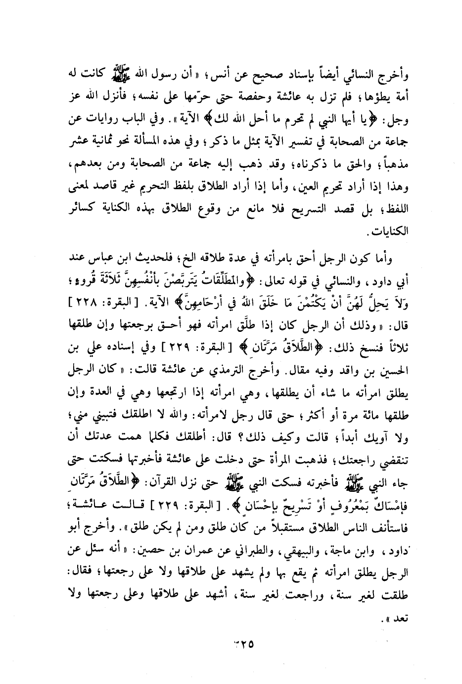 وأخرج النسائي أيضا بإسناد صحيح عن أنس "أن رسول الله صلى الله عليه وسلم كانت له أمة يطؤها فلم تزل به عائشة وحفصة حتى حرمها على نفسه فأنزل الله عز وجل: {يَا أَيُّهَا النَّبِيُّ لِمَ تُحَرِّمُ مَا أَحَلَّ اللَّهُ لَكَ} [التحريم:1] الآية" وفي الباب روايات عن جماعة من الصحابة في تفسير الآية بمثل ماذكر وفي هذه المسألة نحو ثمانية عشر مذهبا والحق ما ذكرناه وقد ذهب إليه جماعة من الصحابة ومن بعدهم وهذا إذا أراد تحريم العين وأما إذا أراد الطلاق بلفظ التحريم غير قاصد لمعنى اللفظ بل قصد التسريح فلا مانع من وقوع الطلاق بهذه الكناية كسائر الكنايات.