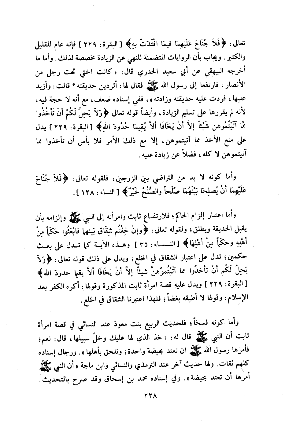تعالى: {فَلا جُنَاحَ عَلَيْهِمَا فِيمَا افْتَدَتْ بِهِ} [البقرة:229] فإنه عام للقليل والكثير ويجاب بأن الروايات المتضمنة للنهي عن الزيادة مخصصة لذلك وأما ما أخرجه البيهقي عن أبي سعيد الخدري قال: كانت أختي تحت رجل من الأنصار فارتفعا إلى رسول الله صلى الله عليه وسلم فقال لها: "أتردين حديقته" قالت: وأزيد عليها فردت عليه حديقته وزادته" ففي إسناده ضعف مع أنه لا حجة فيه لأنه لم يقررها على تسليم الزيادة وأيضا قوله تعال: {وَلا يَحِلُّ لَكُمْ أَنْ تَأْخُذُوا مِمَّا آتَيْتُمُوهُنَّ شَيْئاً إِلَّا أَنْ يَخَافَا أَلَّا يُقِيمَا حُدُودَ اللَّهِ} [البقرة:229] يدل على منع الأخذ مما آتيتموهن إلا مع ذلك الأمر فلا بأس أن تأخذوا مما آتيتموهن لا كله فضلا عن زيادة عليه.