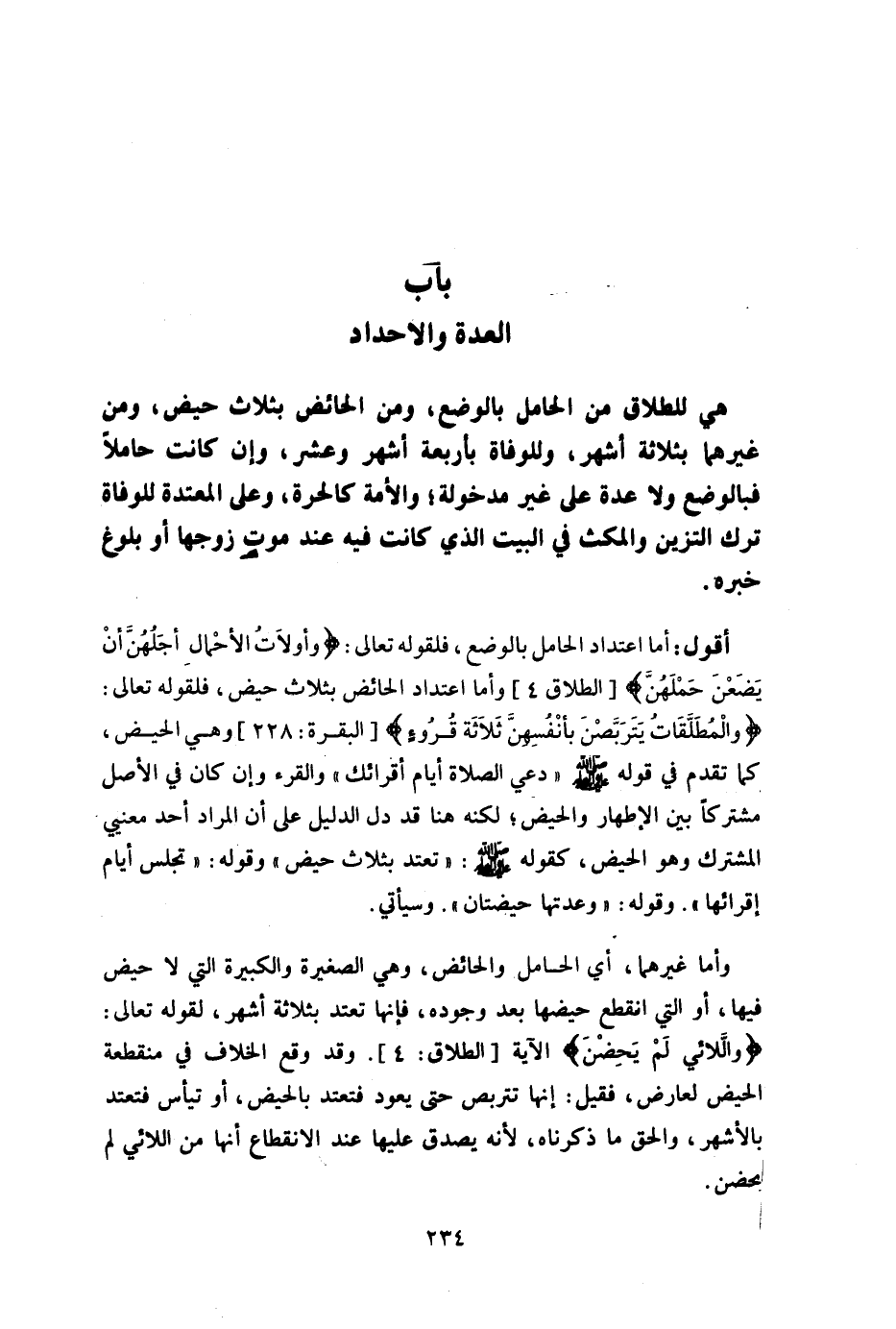 أقول: أما اعتداد الحامل بالوضع فلقوله تعالى: {وَأُولاتُ الْأَحْمَالِ أَجَلُهُنَّ أَنْ يَضَعْنَ حَمْلَهُنَّ} [الطلاق:4] وأما اعتداد الحائض بثلاث حيض فلقوله: تعالى {وَالْمُطَلَّقَاتُ يَتَرَبَّصْنَ بِأَنْفُسِهِنَّ ثَلاثَةَ قُرُوءٍ} [البقرة:228] وهي الحيض كما تقدم في قوله صلى الله عليه وسلم: "دعي الصلاة أيام أقرائك" والقرء وإن كان في الأصل مشتركا بين الأطهار والحيض كقوله: صلى الله عليه وسلم: "تعتد بثلاث حيض" وقوله: "تجلس أيام أقرائها" وقوله: "وعدتها حيضتان" وسيأتي.