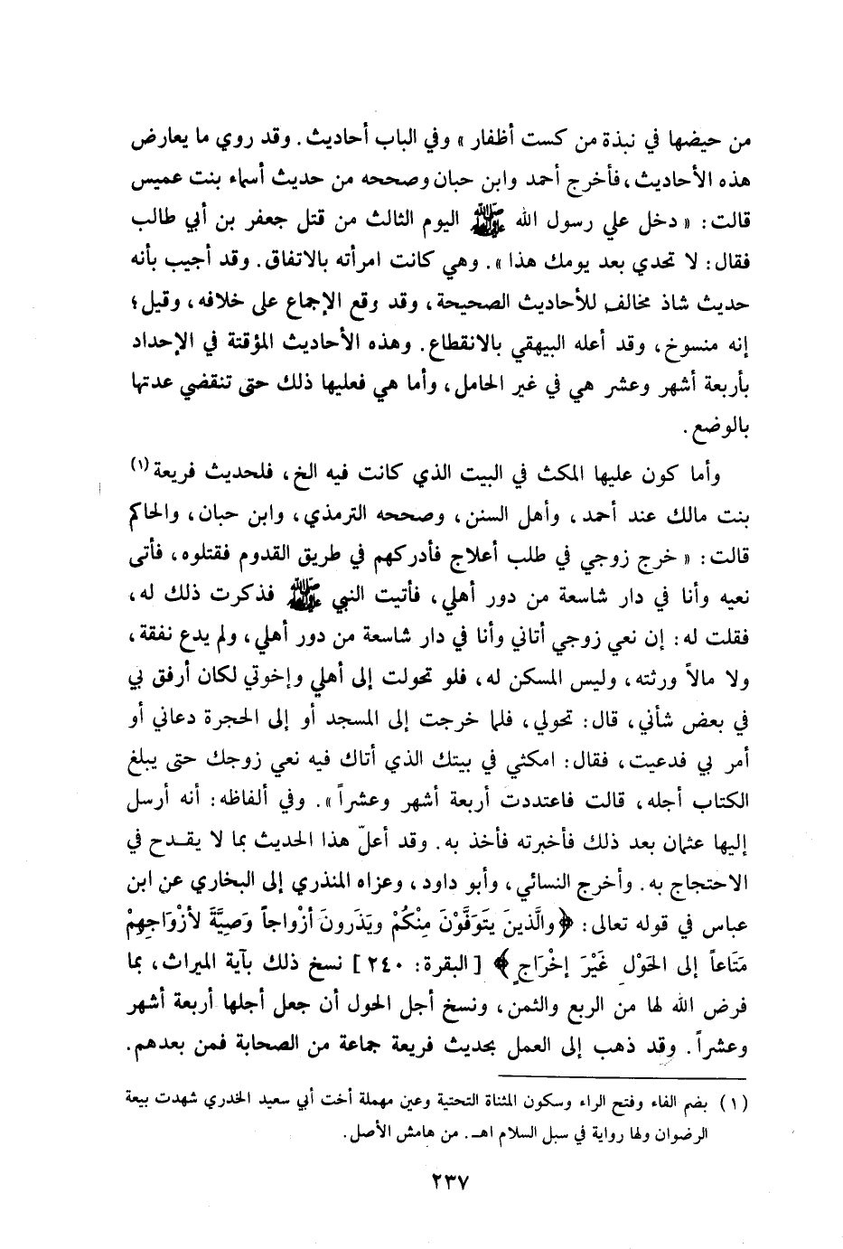 بنت مالك عند أحمد وأهل السنن وصححه الترمذي وابن حبان والحاكم قالت: خرج زوجي في طلب أعلاج فأدركهم في طريق القدوم فقتلوه فأتى نعيه وأنا في دار شاسعة من دور أهلي فأتيت النبي صلى الله عليه وسلم فذكرت ذلك له فقلت له إن نعي زوجي أتاني وأنا في دار شاسعة من دور أهلي ولم يدع لي نفقة ولا مالا ورثته وليس المسكن له فلو تحولت إلى دور أهلي وإخوتي لكان أرفق بي في بعض شأني قال: تحولي فلما خرجت إلى المسجد أو إلى الحجرة دعاني أو أمر بي فدعيت فقال: امكثي في بيتك الذي أتاك فيه نعي زوجك حتى يبلغ الكتاب أجله قالت: فاعتدت أربعة أشهر وعشرا" وفي بعض ألفاظه أنه أرسل إليها عثمان بعد ذلك فأخبرته فأخذ به وقد أعل هذا الحديث بما لا يقدح في الاحتجاج به وأخرج النسائي وأبو داود وغزاه المنذري إلى البخاري عن ابن عباس في قوله تعالى: {وَالَّذِينَ يُتَوَفَّوْنَ مِنْكُمْ وَيَذَرُونَ أَزْوَاجاً وَصِيَّةً لِأَزْوَاجِهِمْ مَتَاعاً إِلَى الْحَوْلِ غَيْرَ إِخْرَاجٍ} [البقرة:240] نسخ ذلك بآية الميراث بما فرض الله عليها من الربع والثمن ونسخ أجل الحول أن جعل أجلها أربعة أشهر وعشرا وقد ذهب إلى العمل بحديث فريعة جماعة من الصحابة فمن بعدهم وقد روى جواز الخروج للعذر عن جماعة من الصحابة فمن بعدهم