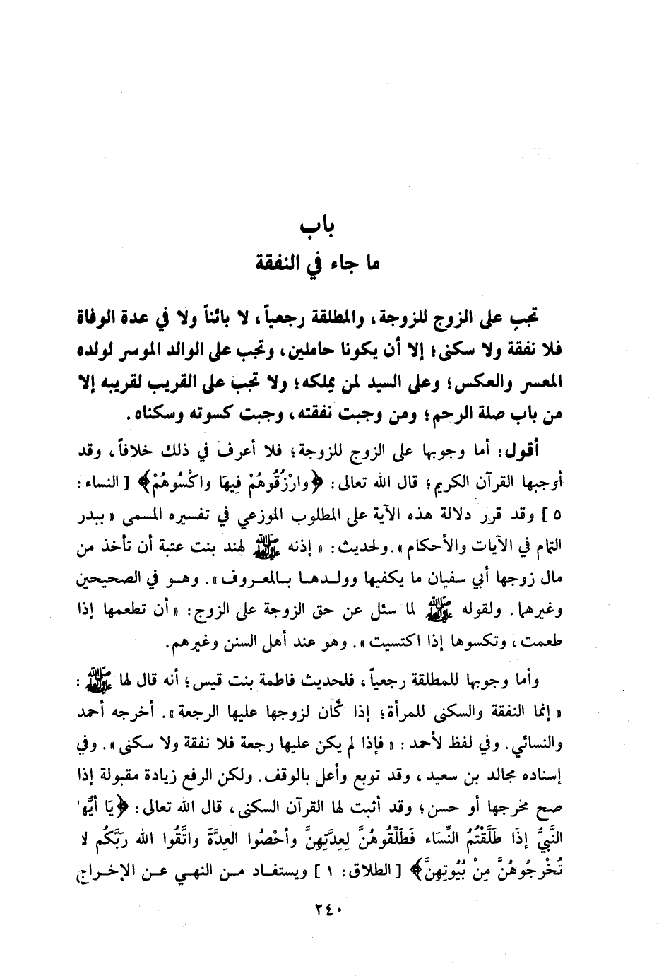 وأما وجوبها للمطلقة رجعيا فلحديث فاطمة بنت قيس أنه قال لها صلى الله عليه وسلم: "إنما النفقة والسكنى للمرأة إذا كان لزوجها عليها الرجعة" أخرجه أحمد والنسائي وفي لفظ لأحمد: "فإذا لم يكن عليها رجعة فلا نفقة ولا سكنى" وفي إسناده مجالد بن سعيد وقد توبع وأعل بالوقف ولكن الرفع زيادة مقبولة إذا صح مخرجها أو حسن وقد أثبت لها القرآن السكنى قال الله تعالى: {يَا أَيُّهَا النَّبِيُّ إِذَا طَلَّقْتُمُ النِّسَاءَ فَطَلِّقُوهُنَّ لِعِدَّتِهِنَّ وَأَحْصُوا الْعِدَّةَ وَاتَّقُوا اللَّهَ رَبَّكُمْ لا تُخْرِجُوهُنَّ مِنْ بُيُوتِهِنَّ} [الطلاق:1] ويستفاد من النهي عن الاخراج