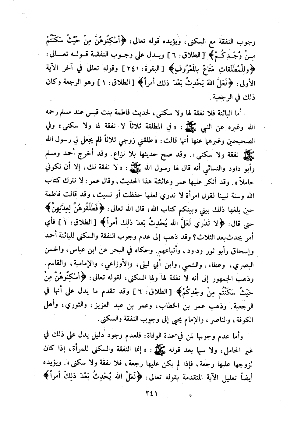 وجوب النفقة مع السكنى ويؤيده قوله تعالى: {أَسْكِنُوهُنَّ مِنْ حَيْثُ سَكَنْتُمْ مِنْ وُجْدِكُمْ} [الطلاق:6] ويدل على وجوب النفقة قوله: تعالى {وَلِلْمُطَلَّقَاتِ مَتَاعٌ بِالْمَعْرُوفِ} [البقرة:241] وقوله تعالى في آخر الآية الأولى: {لَعَلَّ اللَّهَ يُحْدِثُ بَعْدَ ذَلِكَ أَمْراً} [الطلاق:1] وهو الرجعة وكان ذلك في الرجعية.