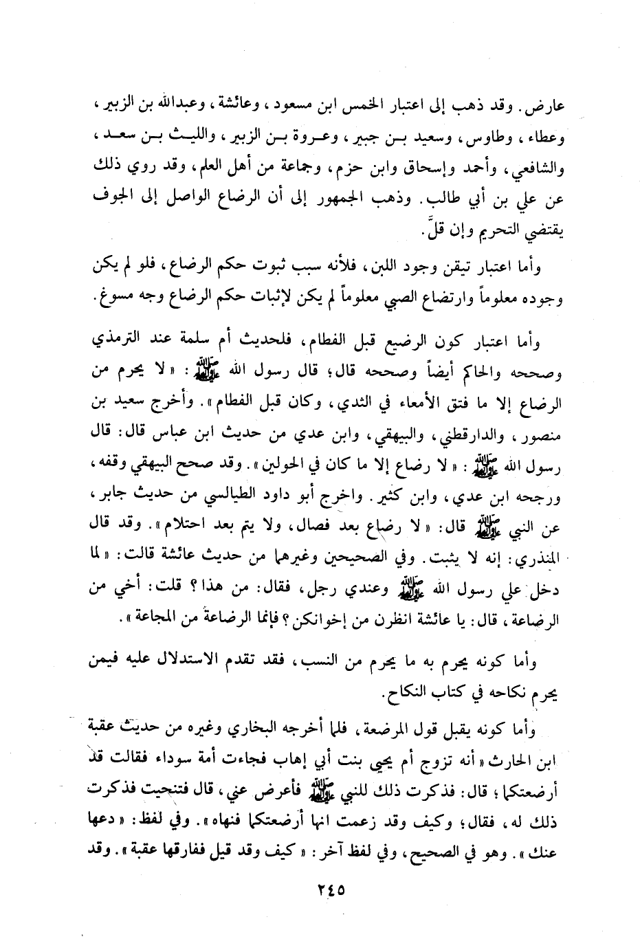 عارض وقد ذهب إلى اعتبار الخمس ابن مسعود وعائشة وعبد الله بن الزبير وعطاء وطاوس وسعيد بن جبير وعروة بن الزبير والليث بن سعد والشافعي وأحمد وإسحاق وابن حزم وجماعة من أهل العلم وقد روى ذلك عن علي بن أبي طالب وذهب الجمهور إلى أن الرضاع الواصل إلى الجوف يقتضي التحريم وإن قل. وأما اعتبار تيقن وجود اللبن فلأنه سبب ثبوت حكم الرضاع فلو لم يكن وجوده معلوما وارتضاع الصبي معلوما لم يكن لإثبات حكم الرضاع وجه مسوغ.