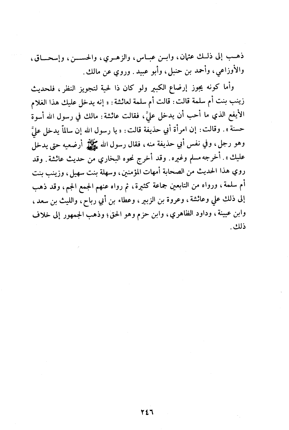 وأما كونه يجوز إرضاع الكبير ولو كان ذا لحية لتجويز النظر فلحديث زينب بنت أم سلمة قالت: قالت أم سلمة لعائشة "إنه يدخل عليك هذا الغلام الأيفع الذي ما أحب أن يدخل علي فقالت: عائشة مالك في رسول الله أسوة حسنه" وقالت: إن امرأة أبي حذيفة قالت: "يارسول الله إن سالما يدخل علي وهو رجل وفي نفس أبي حذيفة منه فقال رسول الله صلى الله عليه وسلم: "أرضعيه حتى يدخل عليك" أخرجه مسلم وغيره وقد أخرجه مسلم وغيره وقد أخرج نحوه البخاري من حديث عائشة وقد روى هذا الحديث من الصحابة أمهات المؤمنين وسهلة بنت سهيل وزينب بنت أم سلمة ورواه من التابعين جماعة كثيرة ثم رواه عنهم الجمع الجم وقد ذهب إلى ذلك علي وعائشة وعروة بن الزبير وعطاء بن أبي رباح والليث بن سعد وابن عيينة وداود الظاهري وابن حزم وهو الحق وذهب الجمهور إلى خلاف ذلك.