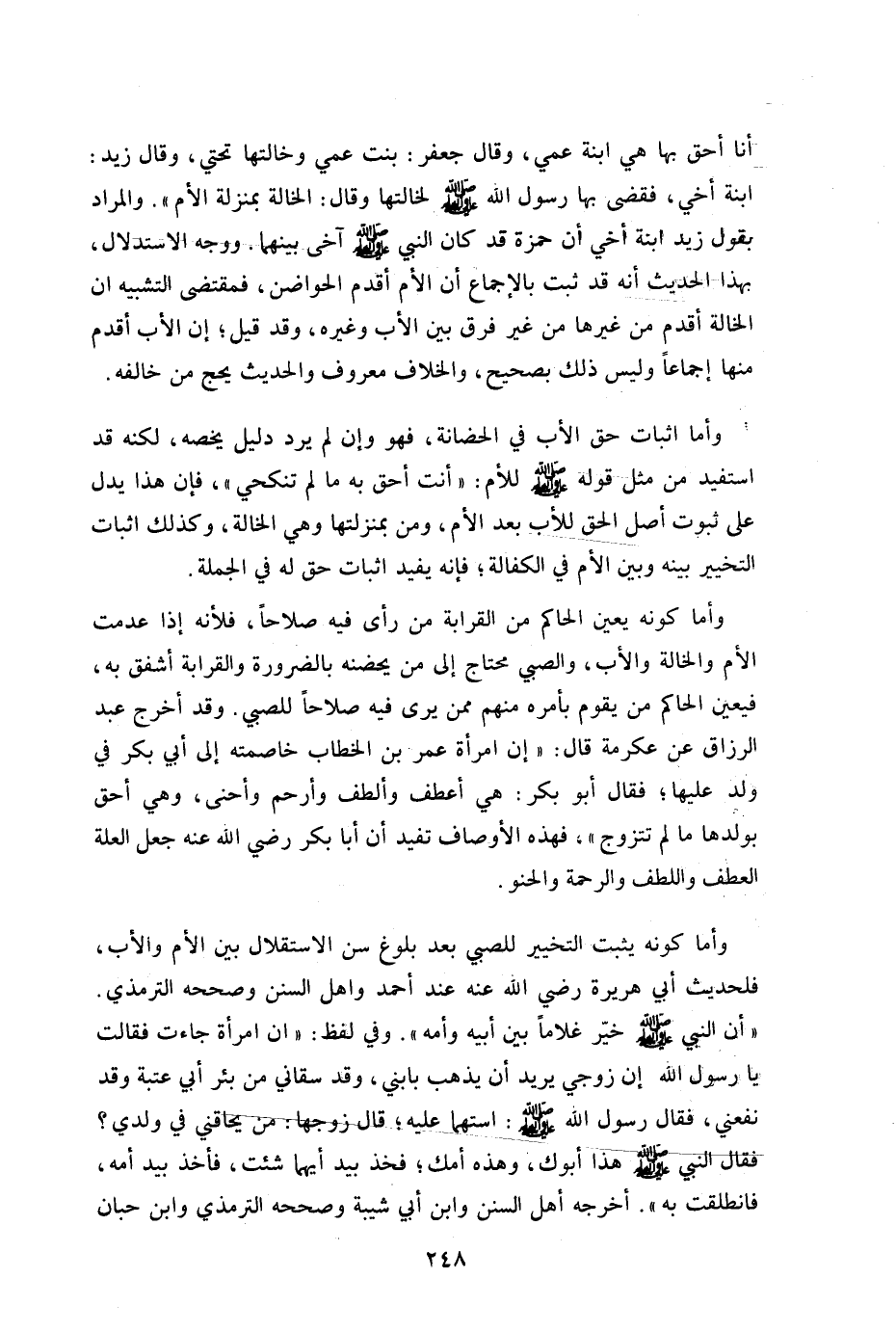 أنا أحق بها هي ابنة عمي وقال: جعفر بنت عمي وخالتها تحتى وقال: زيد ابنة أخي فقضى بها رسول الله صلى الله عليه وسلم لخالتها وقال: "الخالة بمنزلة الأم" والمراد بقول زيد ابنة أخي أن حمزة قد كان النبي صلى الله عليه وسلم آخي بينهما ووجه الاستدلال بهذا الحديث أنه قد ثبت بالإجماع أن الأم أقدم الحواضن فمقتضى التشبيه أن الخالة أقدم من غيرها من غير فرق بين الأب وغيره وقد قيل إن الأب أقدم منها إجماعا وليس ذلك بصحيح والخلاف معروف والحديث يحج من خالفه.