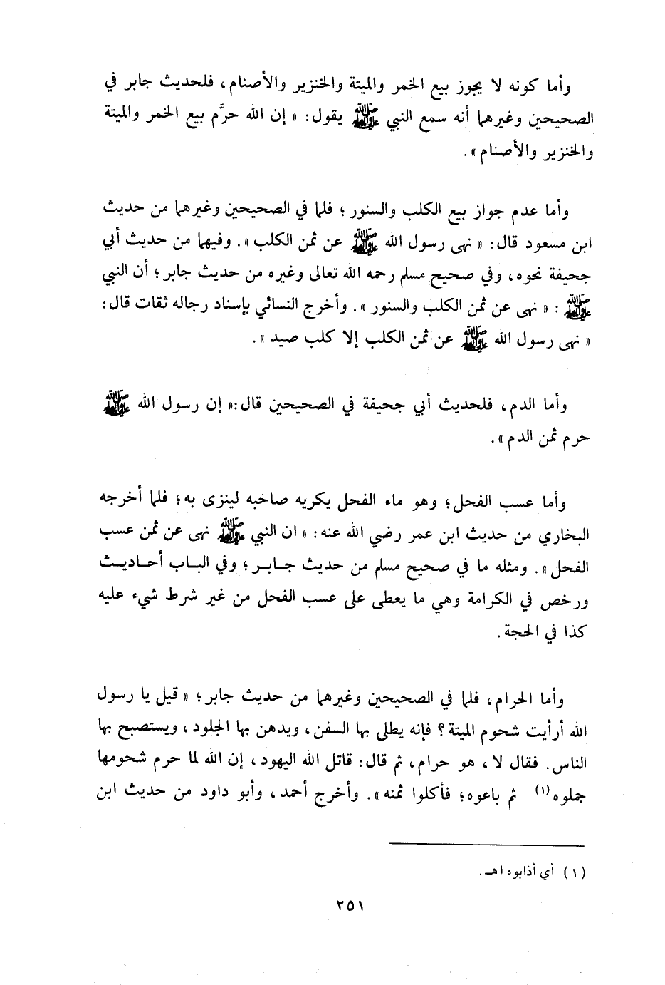 وأما الحرام فلما في الصحيحين وغيرهما من حديث جابر قيل يارسول الله أرأيت شحوم الميتة فإنه يطلي بها السفن ويدهن بها الجلود ويستصبح بها الناس؟ فقال: "لا وهو حرام" ثم قال: "قاتل الله اليهود إن شاء الله لما حرم شحومها جملوه1 ثم باعوه فأكلوا ثمنه" وأخرج أحمد وأبو داود من حديث ابن