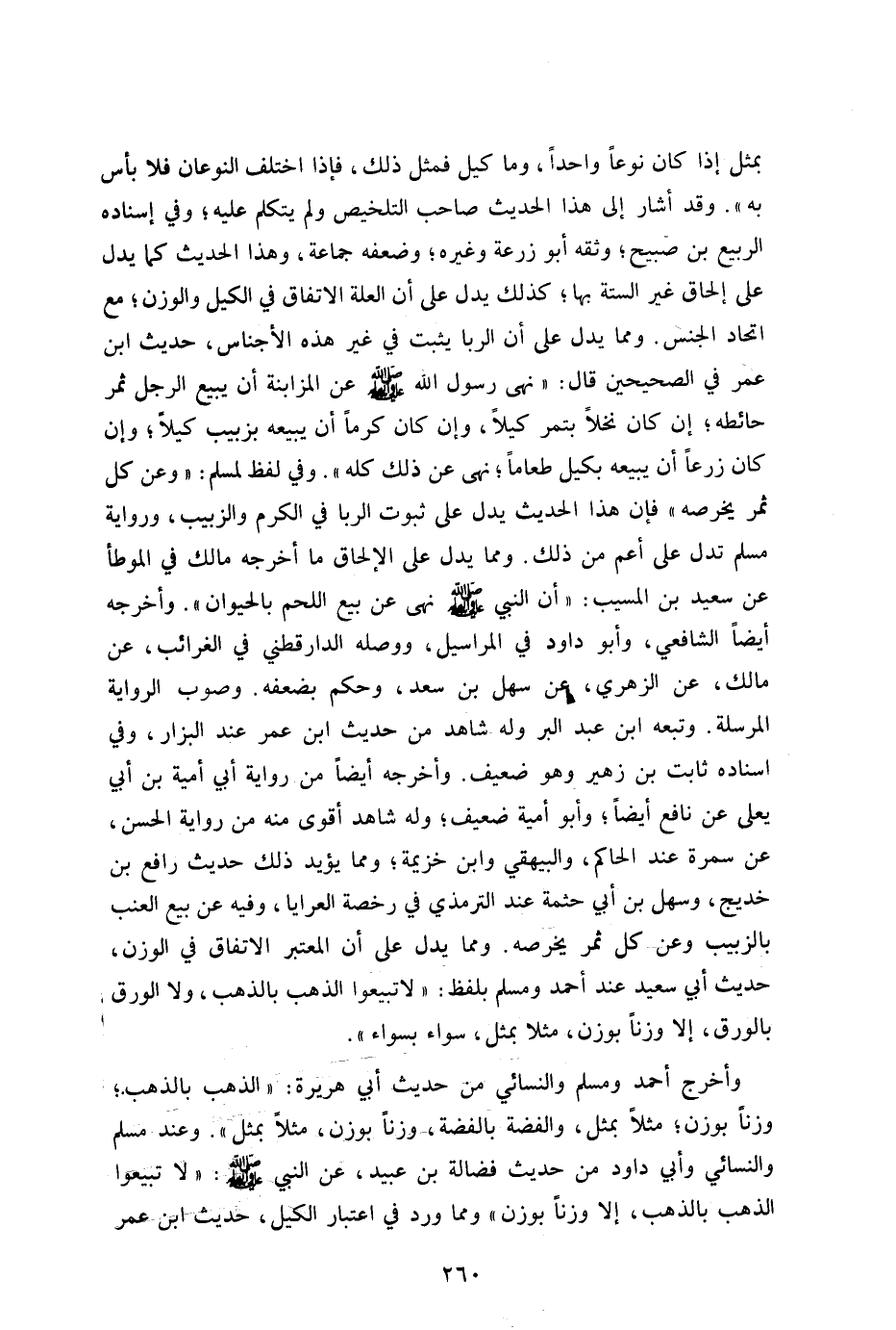 وأخرج أحمد ومسلم والنسائي من حديث أبي هريرة: "الذهب بالذهب وزنا بوزن مثلا بمثل والفضة بالفضة وزنا بوزن مثلا بمثل" وعند مسلم والنسائي وأبي داود من حديث فضالة بن عبيد عن النبي صلى الله عليه وسلم: "لا تبيعوا الذهب بالذهب إلا وزنا بوزن" ومما ورد في اعتبار الكيل حديث ابن عمر