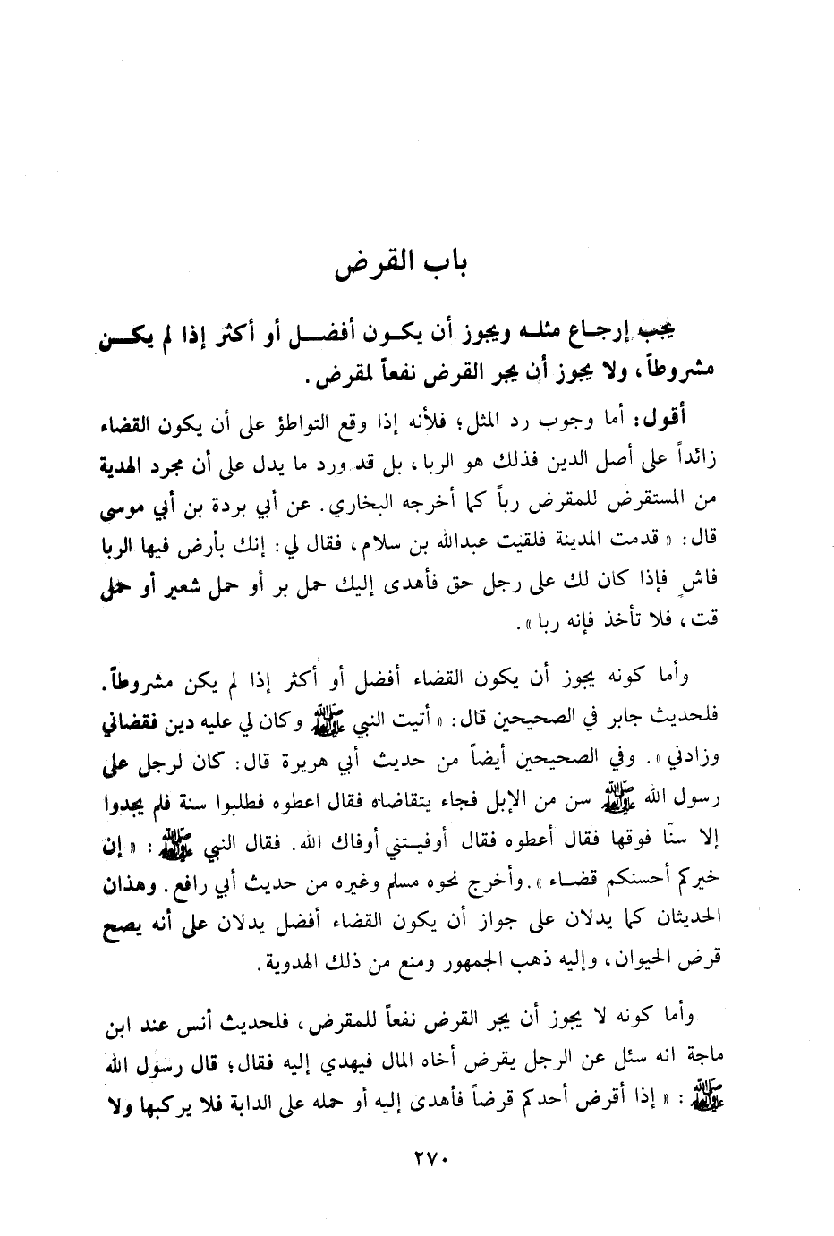 وأما كونه لايجوز أنم يجر القرض نفعا للمقرض فلحديث أنس عند ابن ماجه أنه سئل عن الرجل يقرض أخاه المال فيهدي إليه فقال: قال رسول الله صلى الله عليه وسلم: إذا أقرض أحدكم قرضا فأهدي إليه حمله على الدابة فلا يركبها ولا