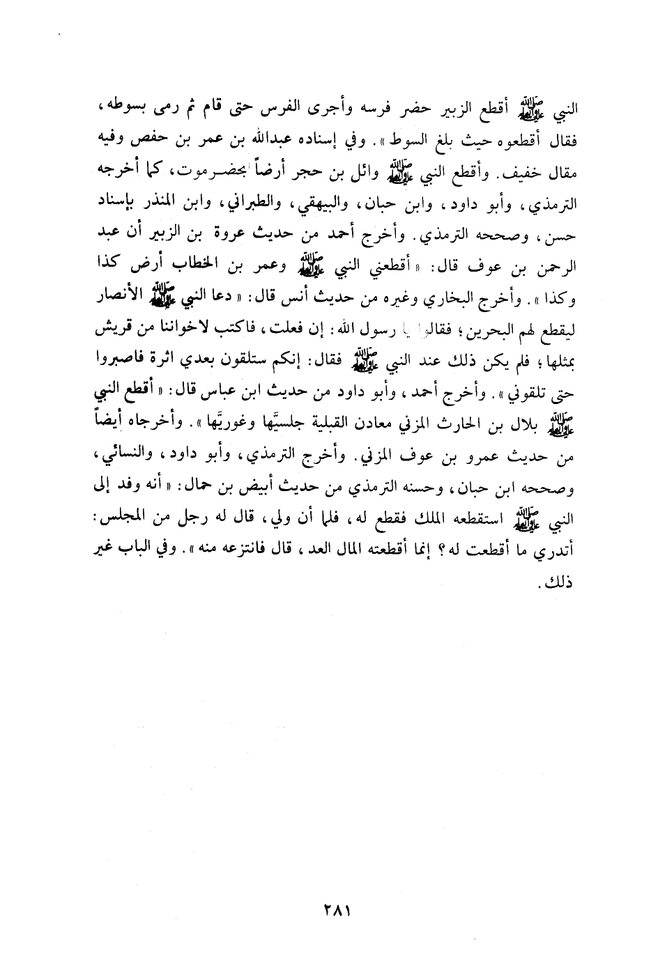 النبي صلى الله عليه وسلم أقطع الزبير حضر فرسه وأجرى الفرس حتى قام ثم رمى بسوطه فقال: اقطعوه حيث بلغ السوط" وفي إسناده عبد الله بن عمر بن حفص وفيه مقال: خفيف وأقطع النبي وائل بن حجر أرضا بحضرموت كما أخرجه الترمذي وأبو داود وابن حبان والبيهقي والطبراني وابن المنذر بإسناد حسن وصححه الترمذي وأخرج أحمد من حديث عروة بن الزبير أن عبد الرحمن ابن عوف قال: أقطعني النبي صلى الله عليه وسلم وعمر بن الحطاب أرض كذا وكذا" وأخرج البخاري وغيره من حديث أنس قال: "دعا النبي صلى الله عليه وسلم الأنصار ليقطع لهم البحرين فقالوا: يارسول الله إن فعلت فاكتب لإخواننا من قريش بمثلها فلم يكن ذلك عند النبي فقال: إنكم ستلقون بعدى أثره فاصبروا حتى تلقوني" وأخرج أحمد وأبوداود من حديث ابن عباس قال: أقطع النبي صلى الله عليه وسلم بلال بن الحارس المزني معادن القبيلة جليسها وغوويها" وأخرجاه أيضا من حديث عمرو بن عوف المزني وأخرج الترمذي وأبو داود والنسائي وصححه ابن حبان وحسنه الترمذي من حديث ابيض بن جمال "أنه وفد إلى النبي صلى الله عليه وسلم استقطعه الملح فقطع له فلما أن ولى قال: له رجل من المجلس أتدري ما أقطعت له إنما أقطعته المال العد قال: فانتزعه منه" وفي الباب غير ذلك