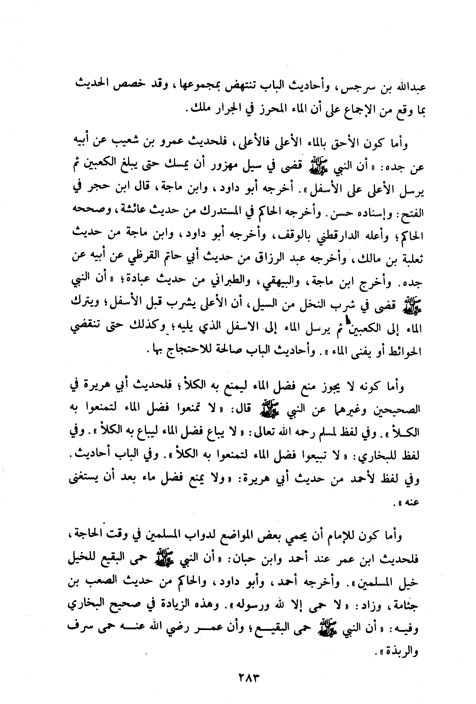 وأما كون للأمام أن يحمي بعض المواضع لدواب المسلمين في وقت الحاجة فلحديث ابن عمر عند أحمد وابن حبان أن النبي صلى الله عليه وسلم حمى البقيع للخيل خيل المسلمين" وأخرجه أحمد وأبو داود والحاكم من حديث الصعب بن جثامة وزاد "لا حمى إلا لله ورسوله" وهذه الزيادة في صحيح البخاري وفيه أن النبي صلى الله عليه وسلم حمى البقيع وإن عمر رضي الله عنه حمى سرف والربذة".